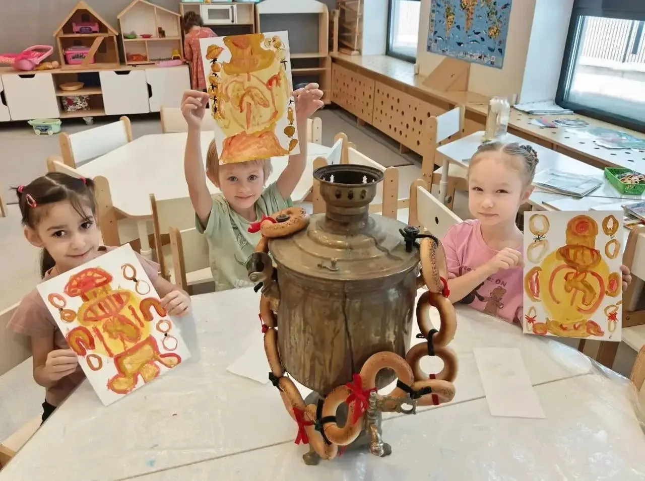 🎨Всю неделю группы наполнялись особым духом. На занятиях по рисованию рождались весёлые солнышки с бантами и румяные Масленицы из цветной бумаги. На музыке разучивались весенние заклички. Воспитатели рассказывали о каждом дне масленичной недели, и дети с удивлением узнавали, что у праздника есть свой строгий порядок и смысл. Стены украсились гирляндами из детских ладошек, похожих на лучистые солнышки, и аппликациями с пузатыми самоварами.