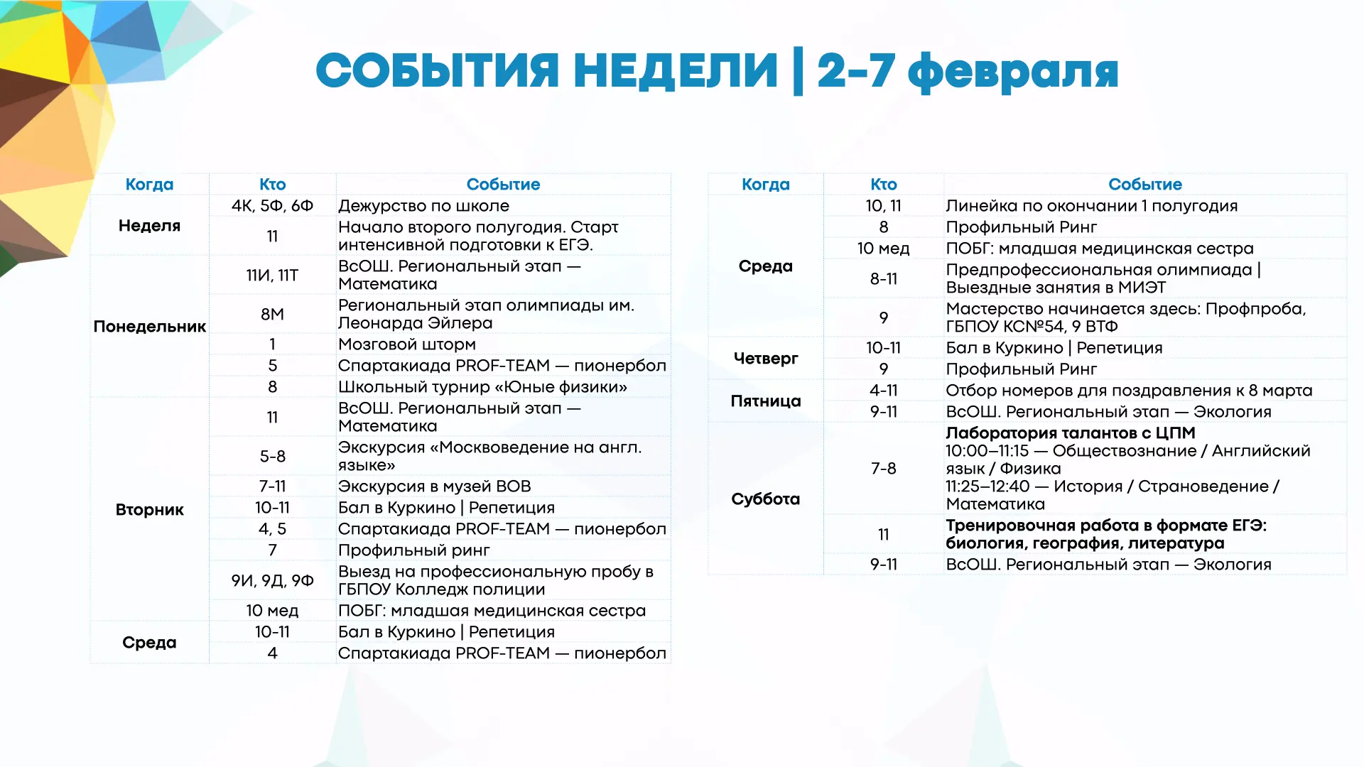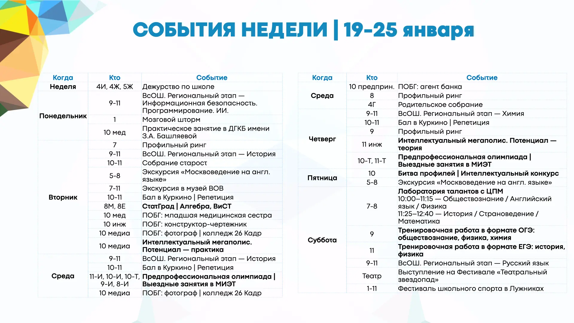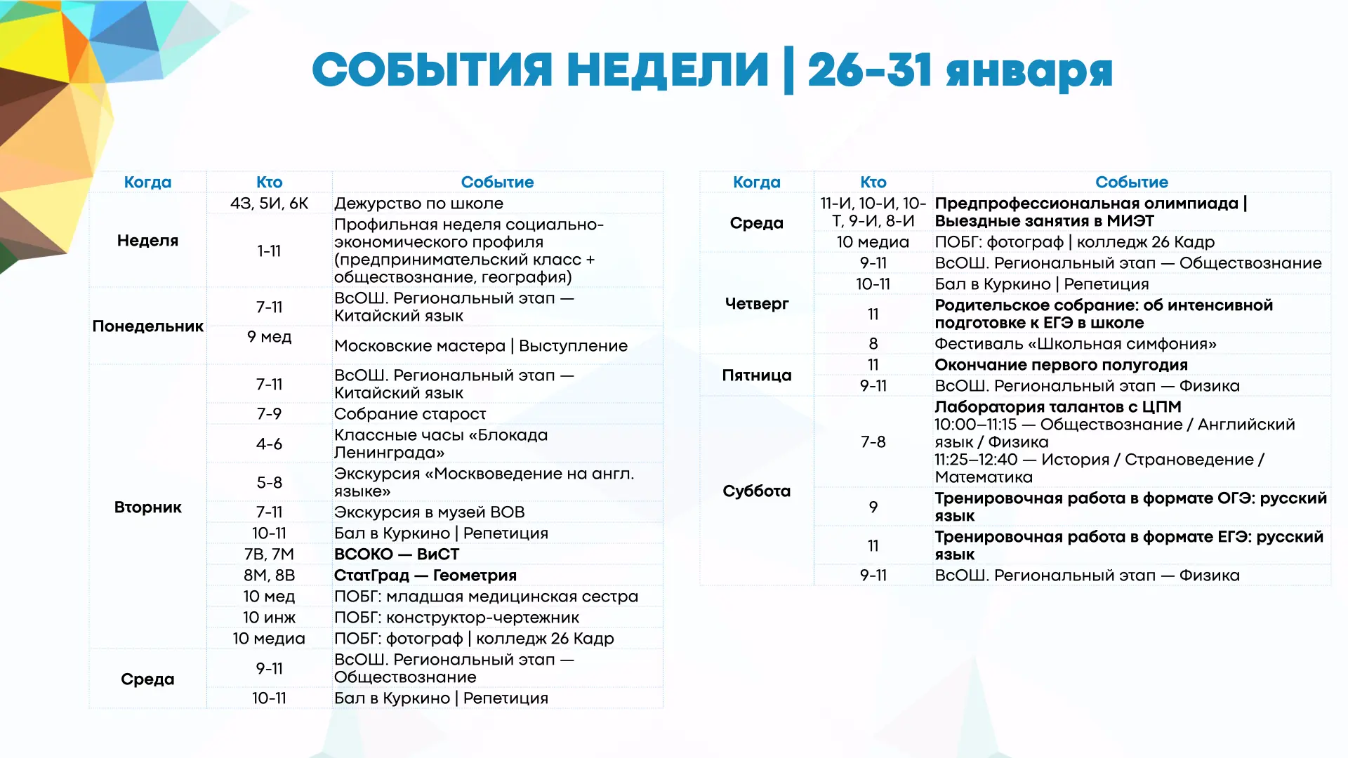 В четверг ждём родителей одиннадцатиклассников на информационную встречу о переходе на режим интенсивной подготовки к экзаменам во II полугодии. Завершим неделю пробником по русскому языку в 9-х и 11-х классах.