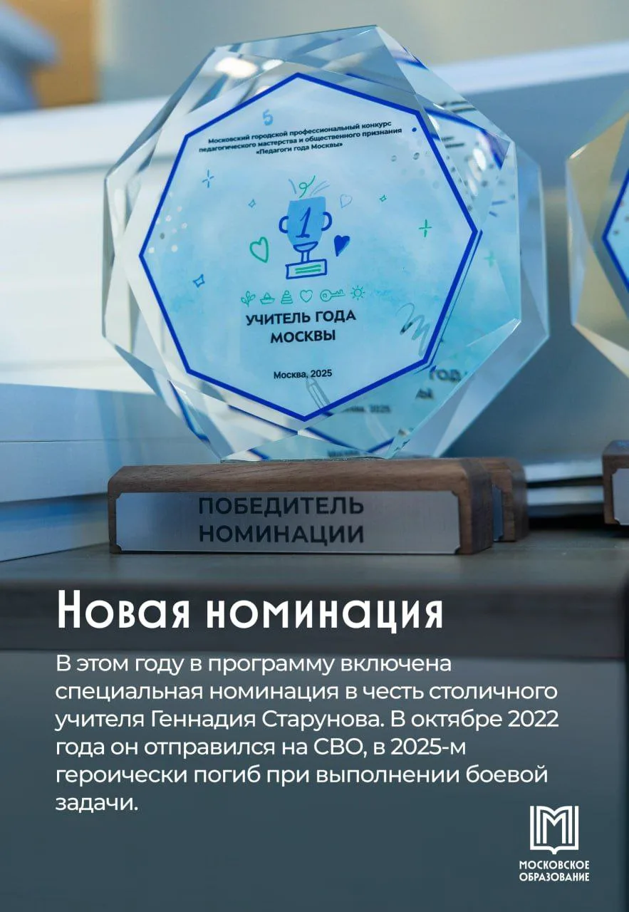 «Мы приглашаем всех столичных педагогов показать свои профессиональные достижения, рассказать о себе, обменяться опытом в рамках конкурса. В этом году главным нововведением конкурса станет новая номинация. В ней мы отметим педагогов, которые внесли особый вклад в патриотическое воспитание, поддержку бойцов СВО и новых регионов. Она будет названа в честь героя, столичного учителя Геннадия Старунова», — рассказала Анастасия Ракова.