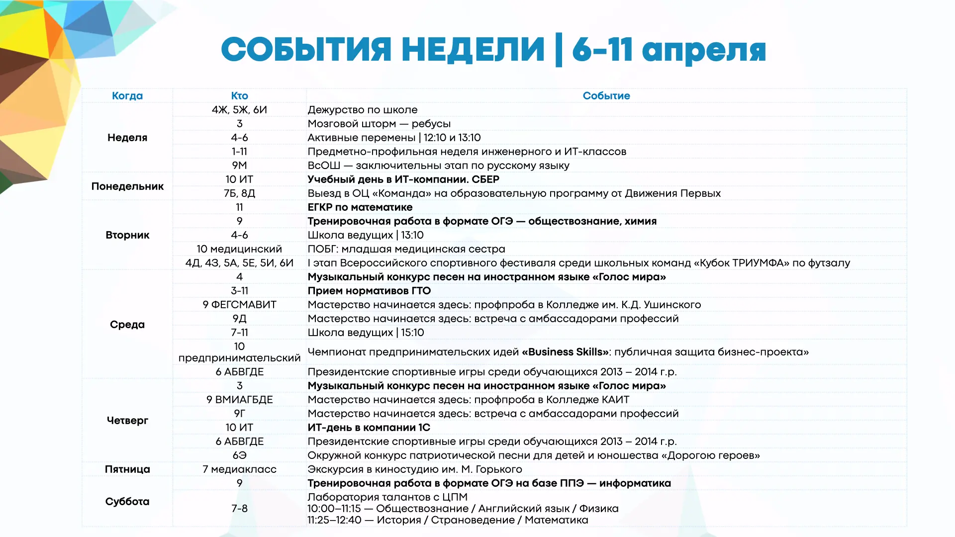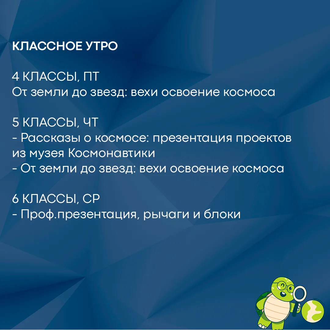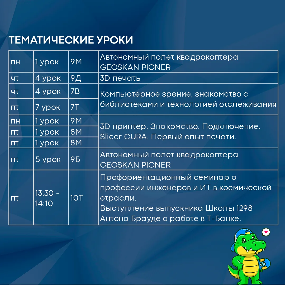 Инженерно-космический и ИТ-профиль вместе с учителями физики и информатики готовят насыщенную программу предметно-профильной недели. Но об этом в завтрашней публикации. Другие события недели — в карточке.