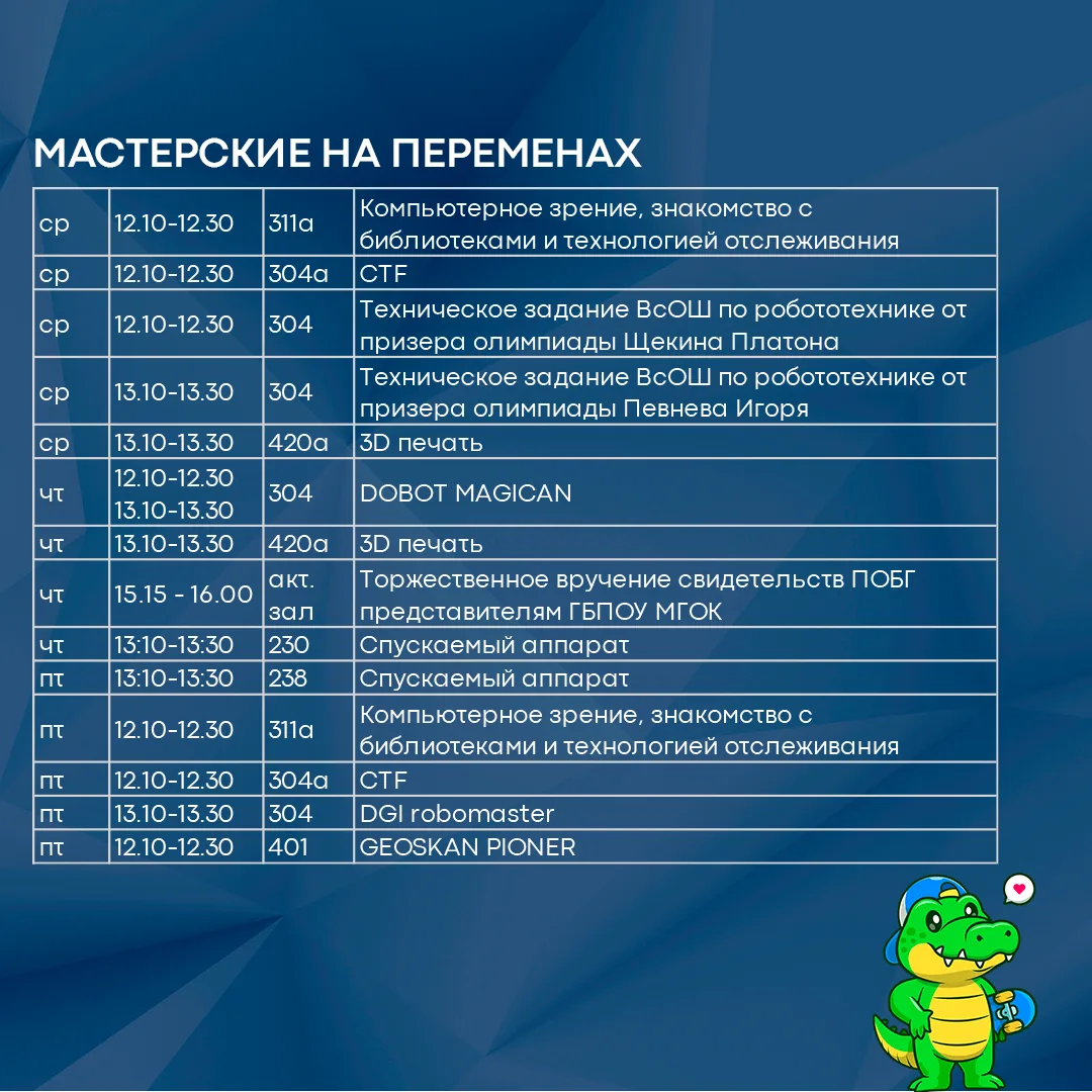 🔵 Для девятиклассников Крокодила утром — информация об образовательном маршруте школьника. Весь остальной день (и перемены, и уроки) посвящён получению практических навыков.