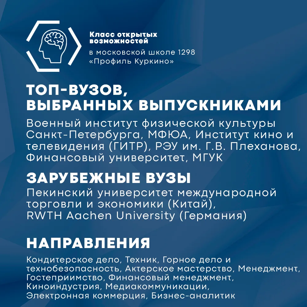 Подобные программы — часть системы профильного обучения в московской Школе 1298. Курсы на базе вуза позволяют ученикам получить первый опыт в выбранной области и развить навыки, важные для дальнейшего обучения.