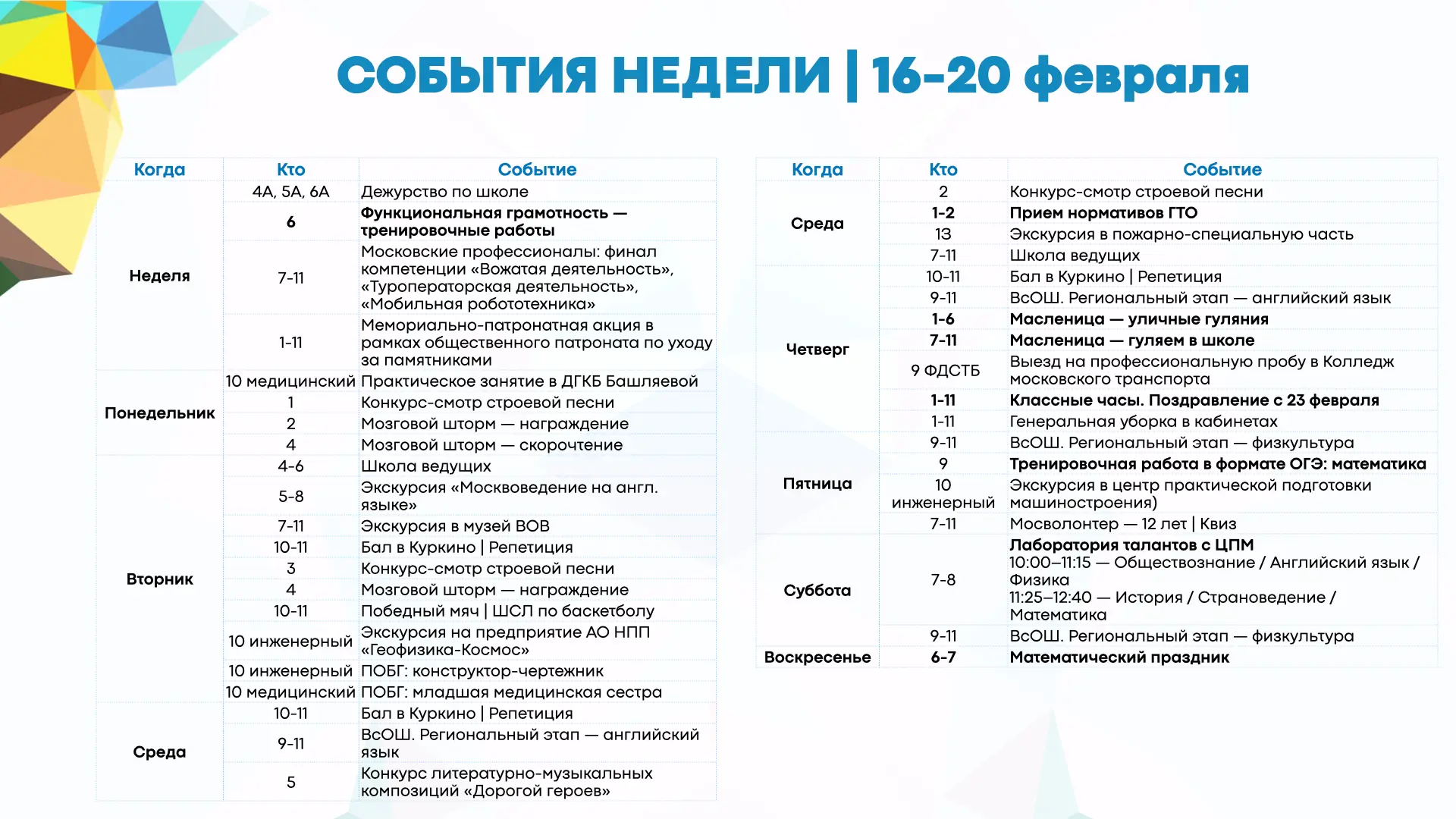 По утрам до уроков — первые репетиции Бала в Куркино, а завершим неделю пробниками ГИА, выступлением школьного театра и большим фестивалем школьного спорта, куда приглашаем ребят и родителей.