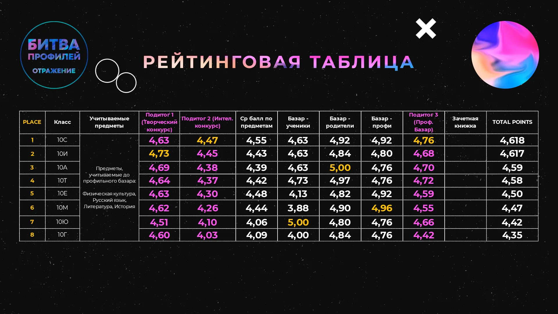 А вот новые результаты рейтинговой таблицы после профильного базара на экране.