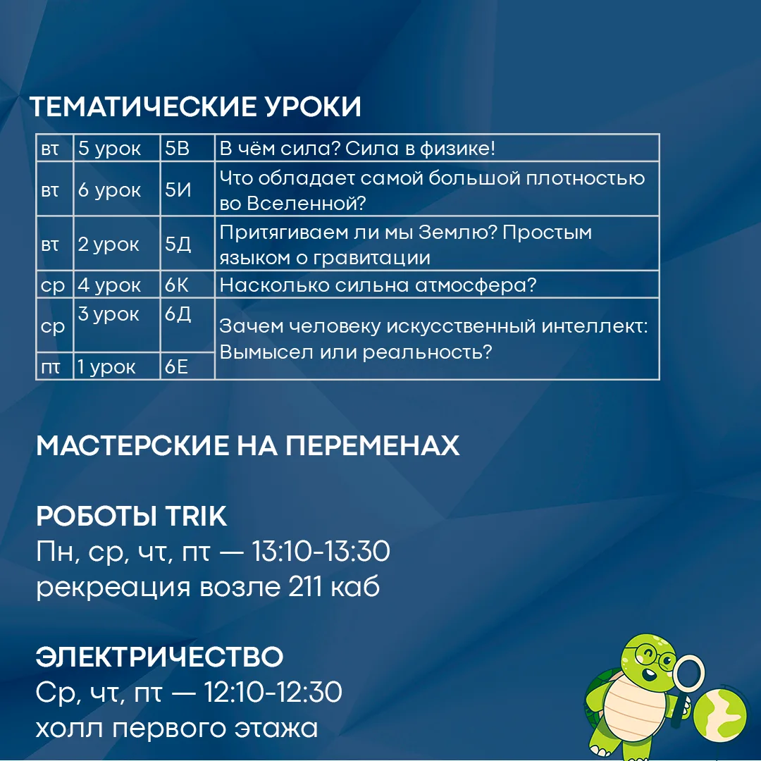 Большой анонс уроков, мастерских и лекториев от старшеклассников и педагогов технических наук — в карточках.