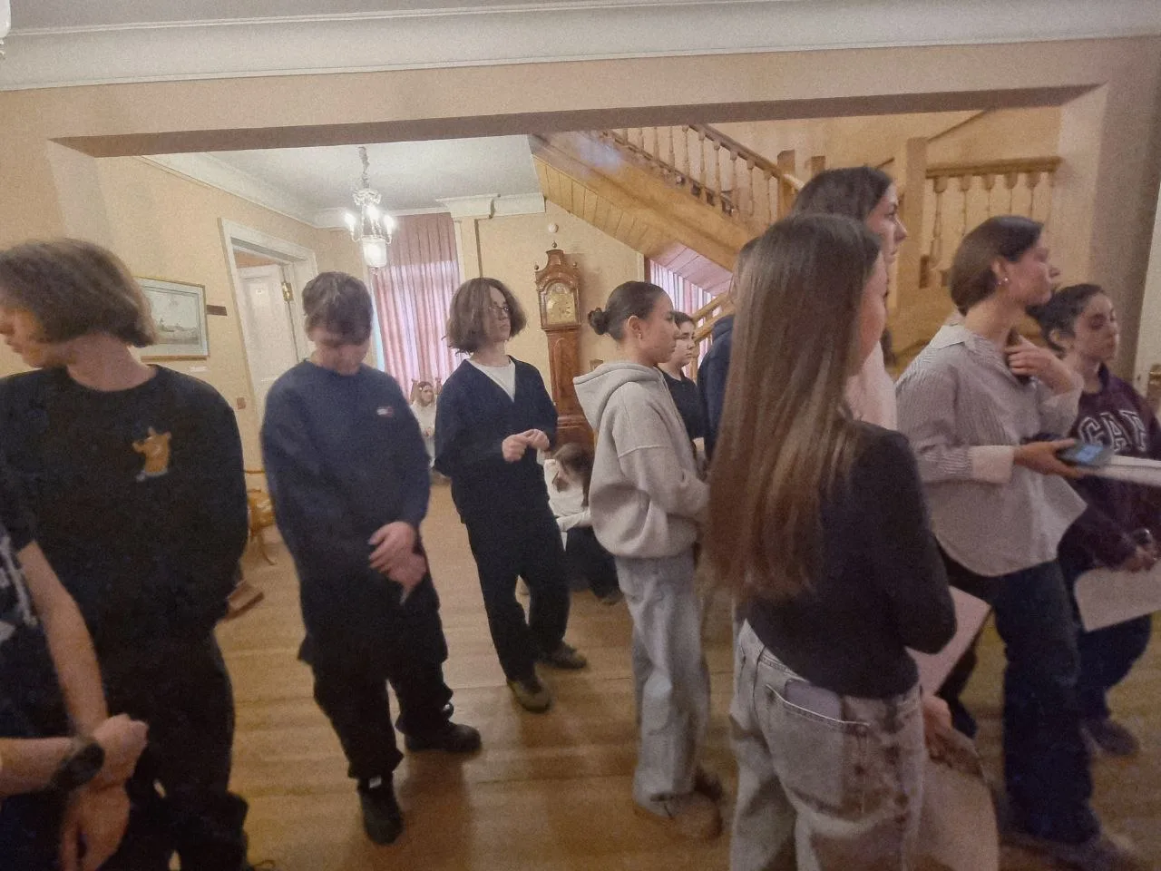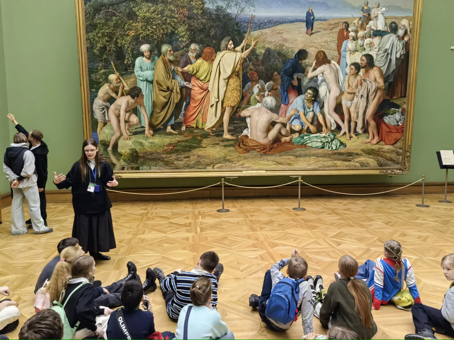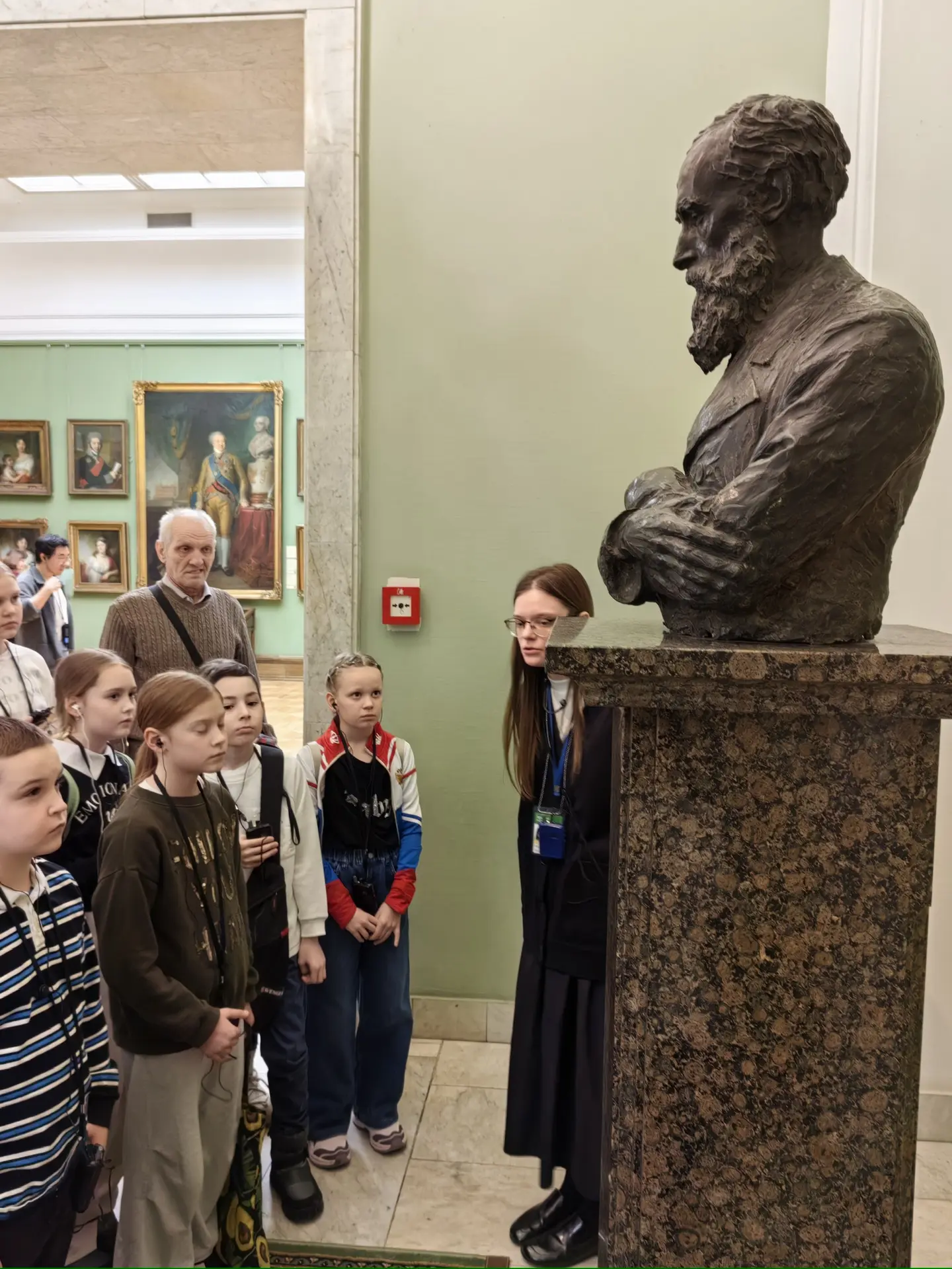 📌 Во время экскурсии школьники увидели выдающиеся произведения русского искусства. Среди них — парадные портреты XVIII века, портрет А.С. Пушкина, «Всадница» Карла Брюллова, монументальное полотно Александра Иванова «Явление Христа народу», а также пейзажи Ивана Шишкина, Ивана Айвазовского и Архипа Куинджи