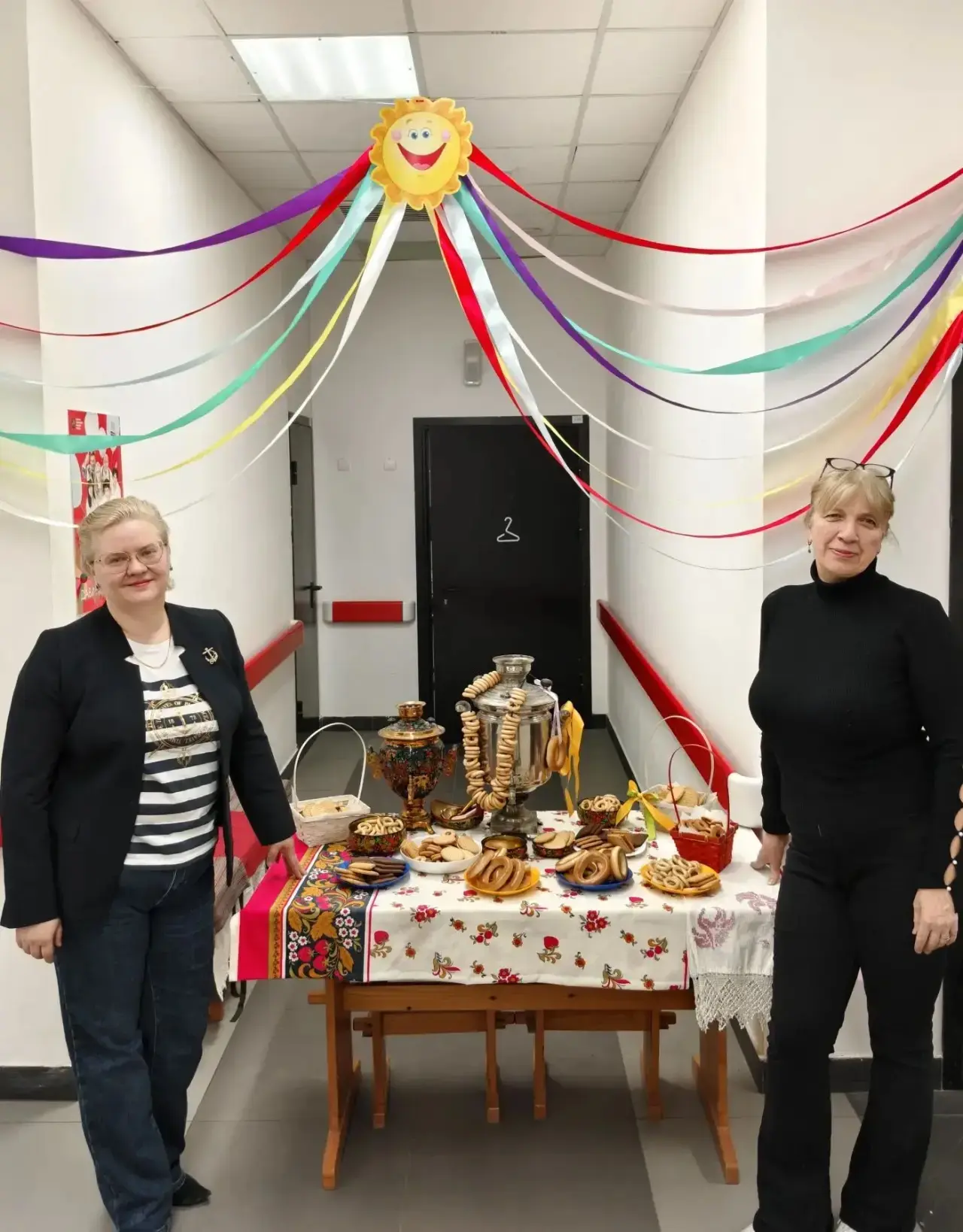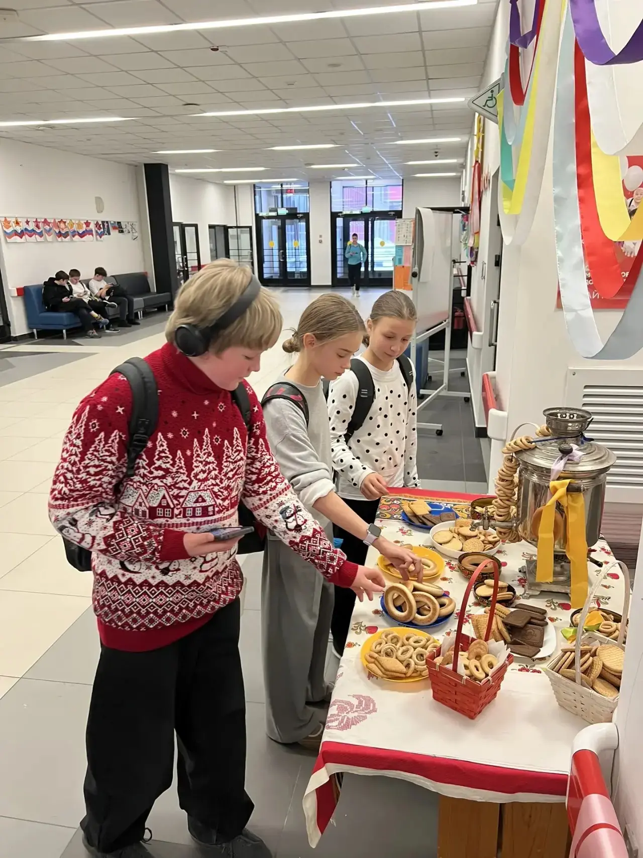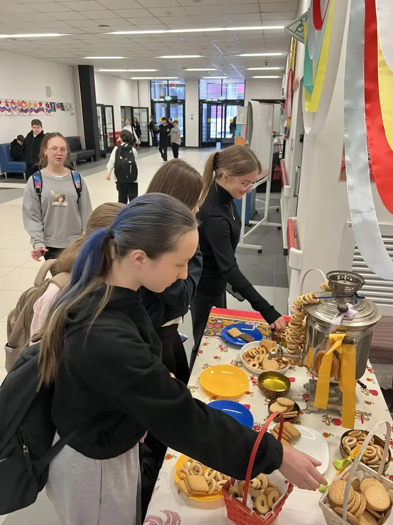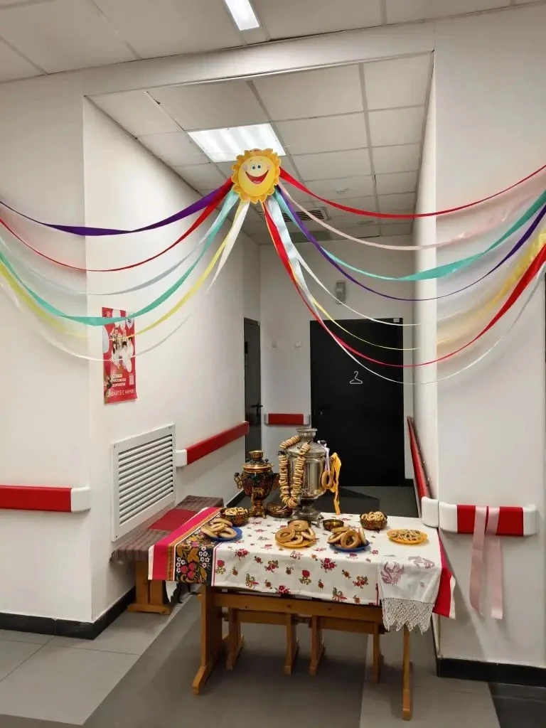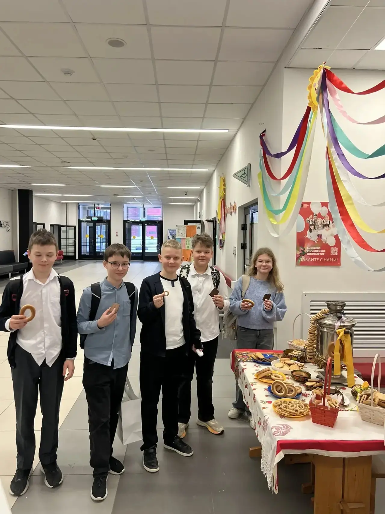 🥞 Особое внимание привлекает интерактивная фотозона, оформленная в традиционном русском стиле. Центром композиции стал самовар, окруженный связками душистых сушек. Здесь каждый может не только сделать памятное фото, но и угоститься и зарядиться бодростью и настроением. Эта зона стала популярным местом для общения учеников и учителей, объединяя всех в предвкушении весеннего обновления