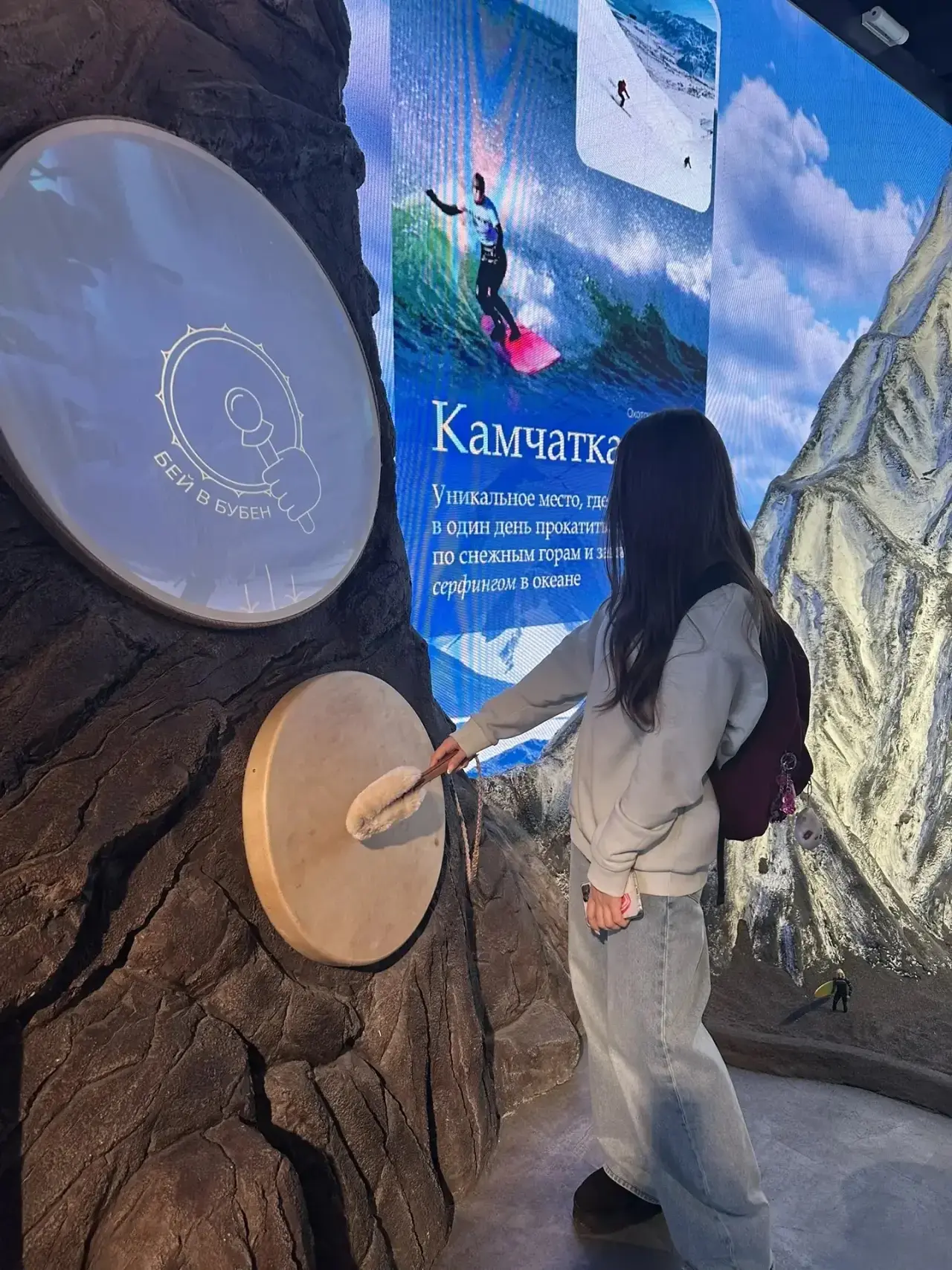 👉 Начали с Дальнего Востока: увидели макет дальневосточного вулкана и образцы вулканического песка с местных пляжей. Экскурсовод рассказал, что Камчатка — уникальное место, где в один день можно покататься на горных лыжах и заняться серфингом. Каждый смог постучать в шаманский бубен, загадав желание. Мы узнали о Русском мосте длиной 3,1 км и покрутили буддийский молитвенный барабан, призывая благополучие