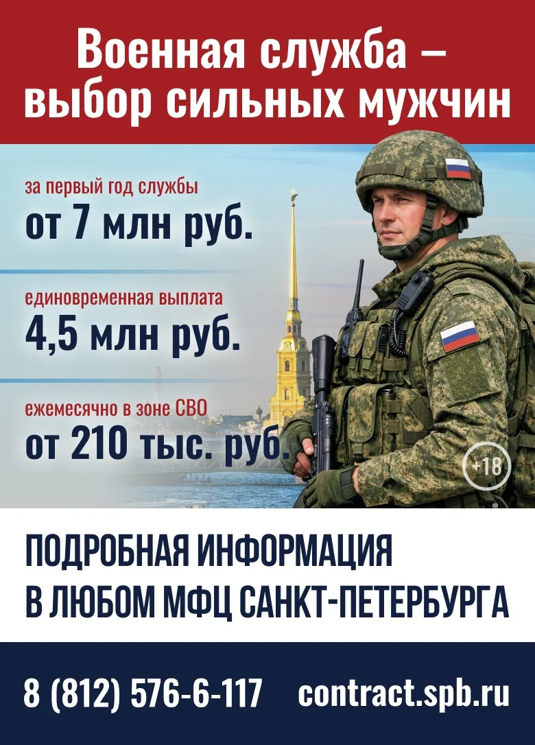 🎖Размер выплаты для заключивших контракт на военную службу в Санкт-Петербурге составит более 7 млн рублей, из них 4,5 млн рублей выплатят сразу после заключения контракта.