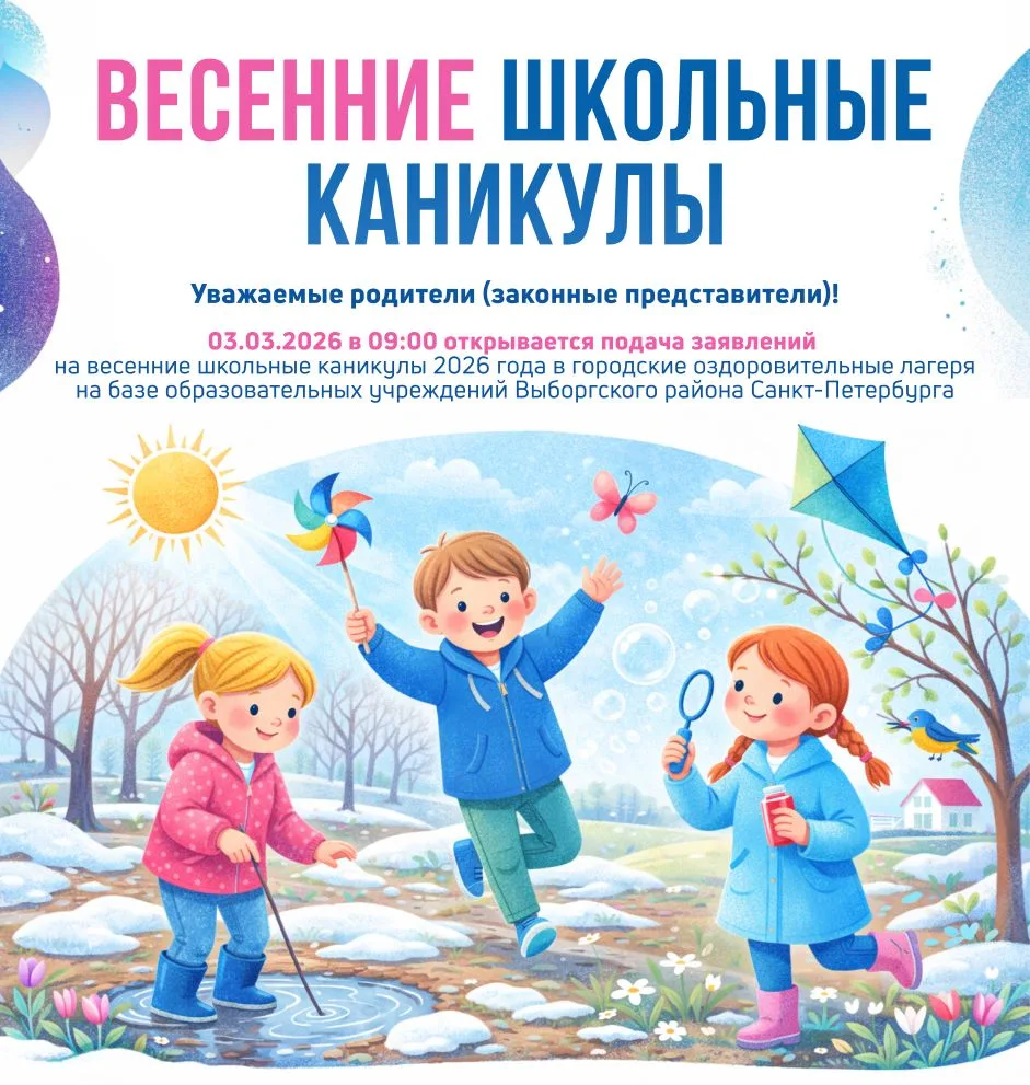 03.03.2026 в 09:00 открывается подача заявлений на весенние школьные каникулы 2026 года в городские оздоровительные лагеря на базе образовательных учреждений Выборгского района Санкт-Петербурга