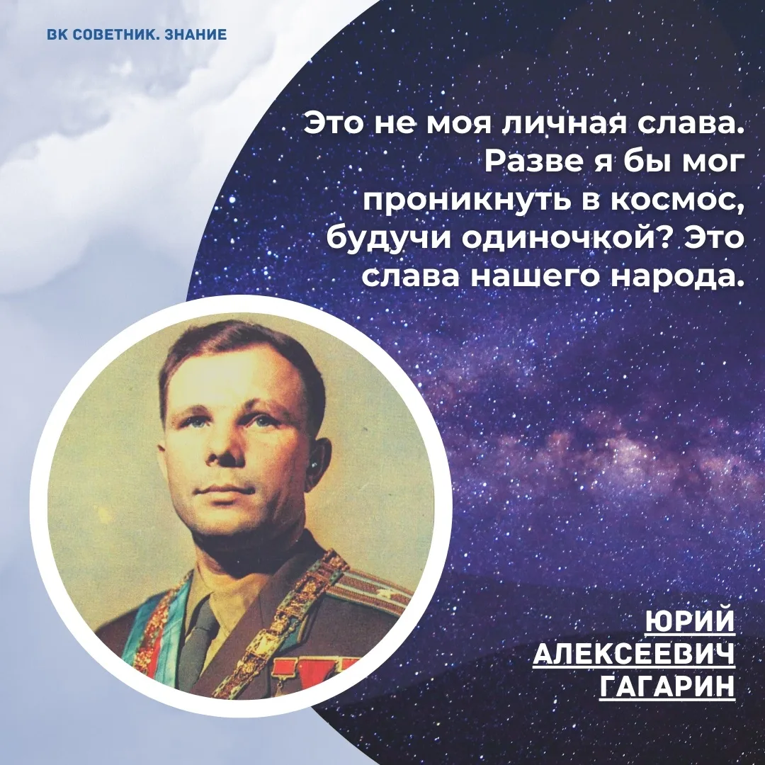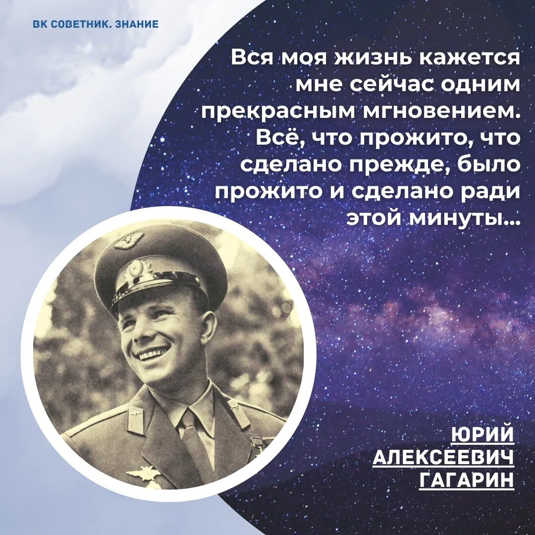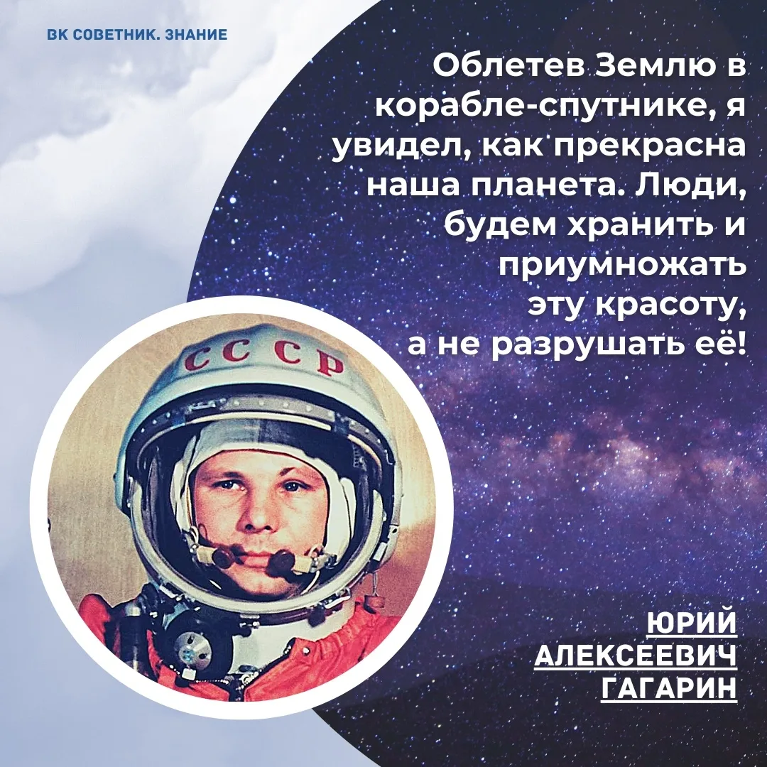"Облетев Землю на корабле-спутнике, я увидел, как прекрасна наша планета. Люди, будем хранить и приумножать эту красоту, а не разрушать её!" – оставил такое послание всем людям Юрий Гагарин.