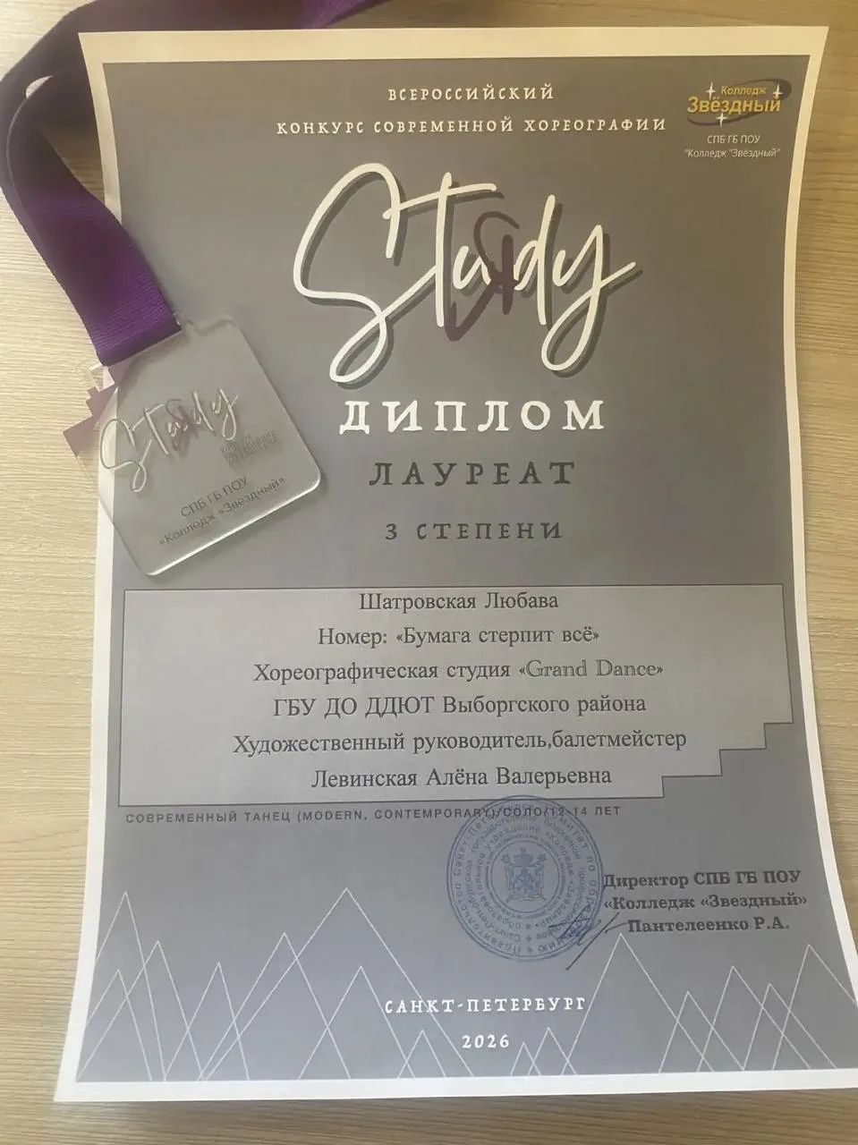 Поздравляем Шатровскую Любаву-учащуюся 8 класса хореографической студии «Grand Dance» студии с премьерой сольного номера «Бумага стерпит всё» и 3 местом на всероссийском конкурсе современной хореографии «Стадия» в колледже «Звездный»