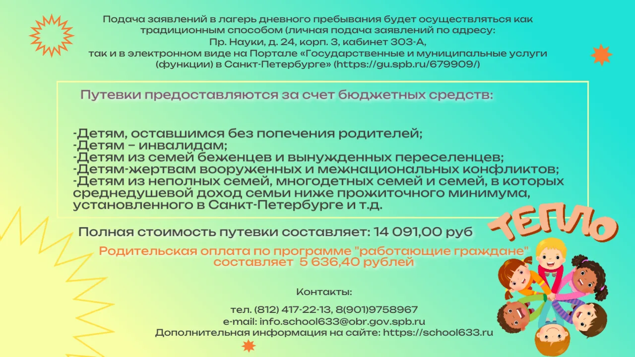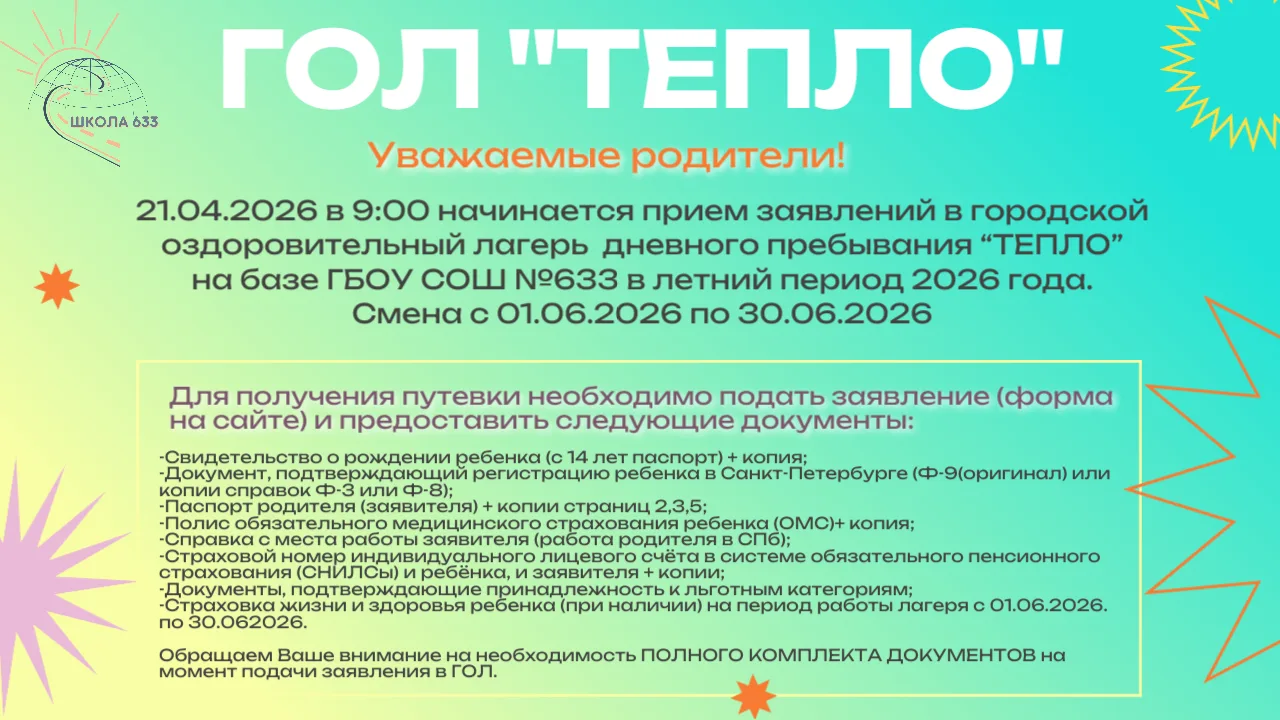 ‼21.04.2026 в 9:00 утра в нашей школе №633 по адресу г. Санкт-Петербург, проспект Науки, дом 24, корпус 3, литер А начинается прием документов в лагерь.‼