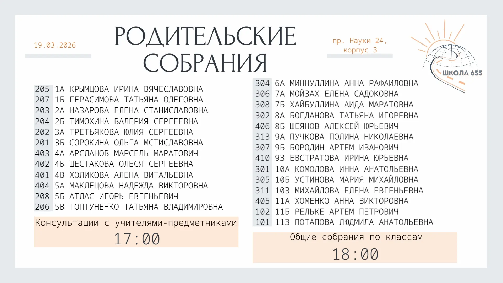 💫 Для Вас состоятся родительские собрания 19 марта 2026 года по адресу: проспект Науки дом 24 корпус 3 ❗️