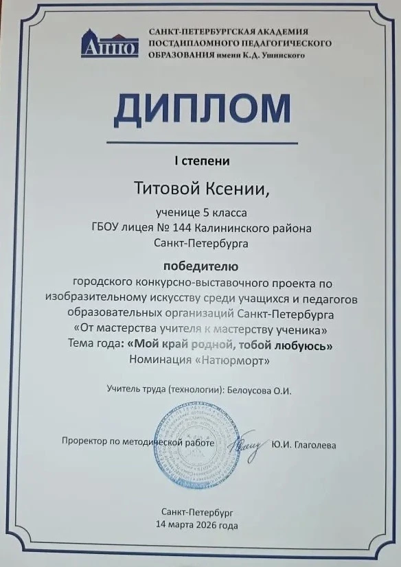 Поздравляем Титову Ксению, учащуюся 5-го класса, ставшую победителем городского конкурса «От мастерства учителя — к мастерству ученика» в номинации „Натюрморт“.