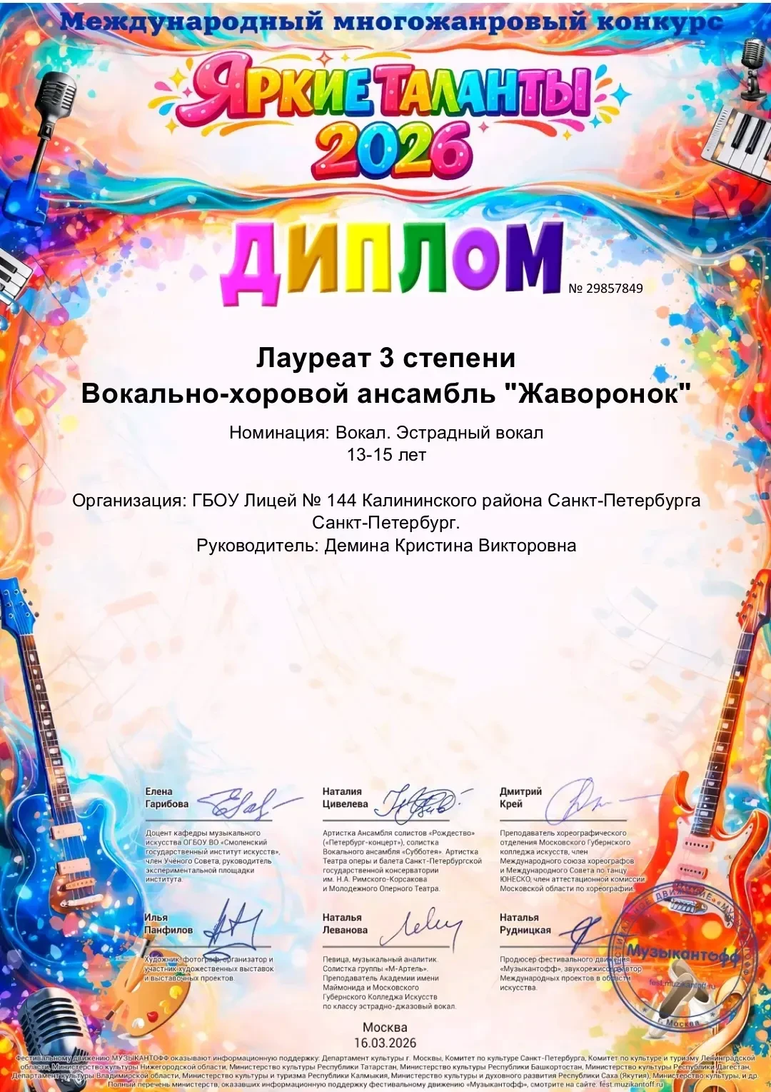 Вокально‑хоровой ансамбль «Жаворонок» занял почётное третье место на международном многожанровом конкурсе «Яркие таланты 2026»!