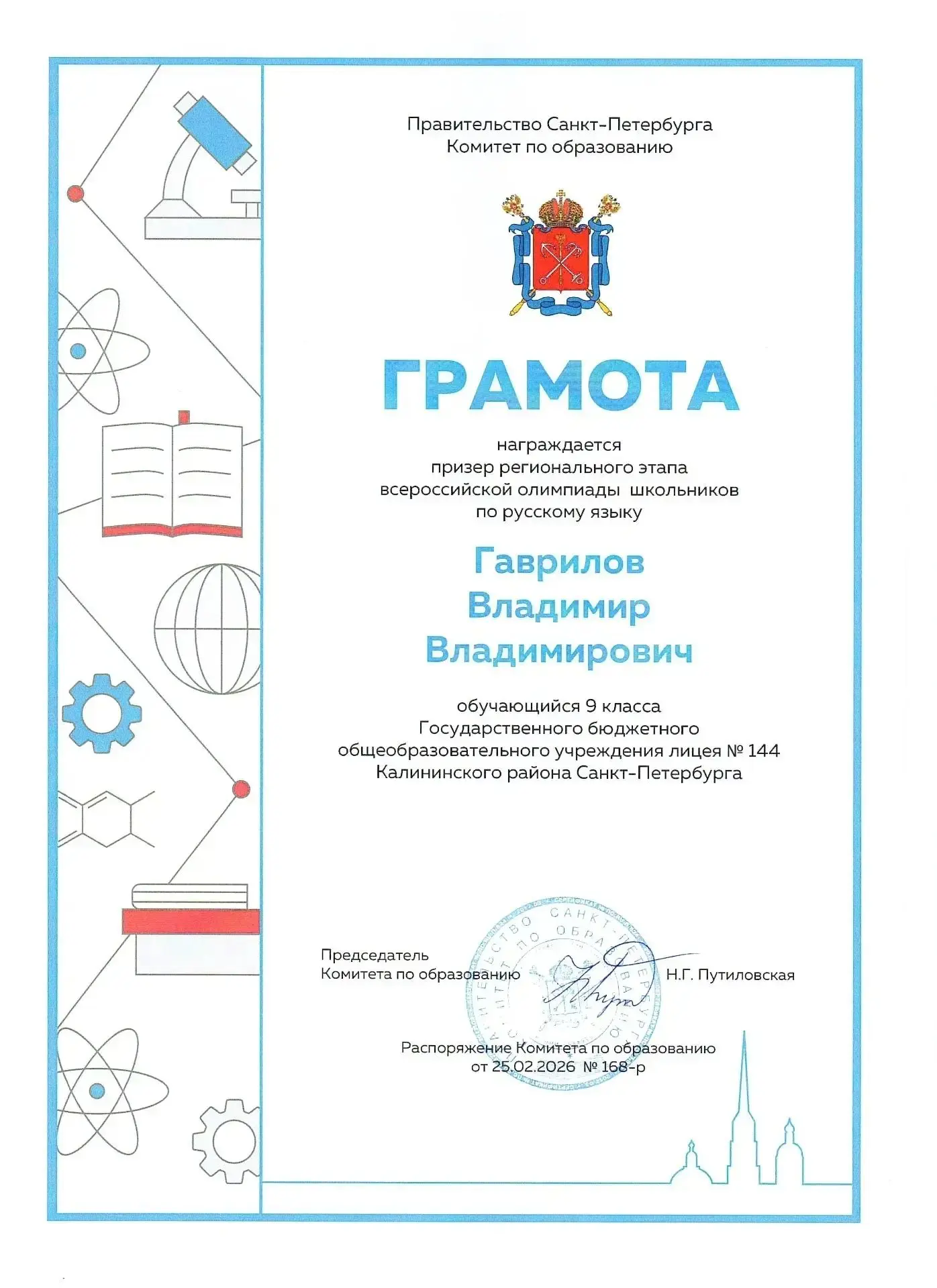 🔹 Активной участнице жизни класса и лицея, призёру Всероссийского конкурса «Моя исследовательская работа», участнице олимпиад «Ростконкурс», «Смарт Кенгуру», «Русский Медвежонок», кандидату в мастера спорта, члену сборной Санкт-Петербурга по спортивной акробатике, победительнице всероссийских и региональных соревнований, включая «Кубок Волкова», первенства Санкт-Петербурга и СЗФО, спартакиаду учащихся России, обладательнице золотого знака отличия ГТО II ступени, ученице 4 «А» класса – Матаеевой Алисе;