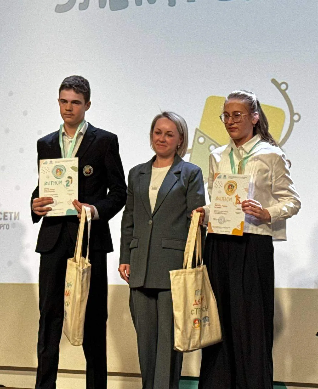 Анна и Тимур получили дипломы победителей и памятные сувениры от организаторов конкурса, также их любовь к математике была вознаграждена просмотром мультфильма «Три богатыря и свет клином».