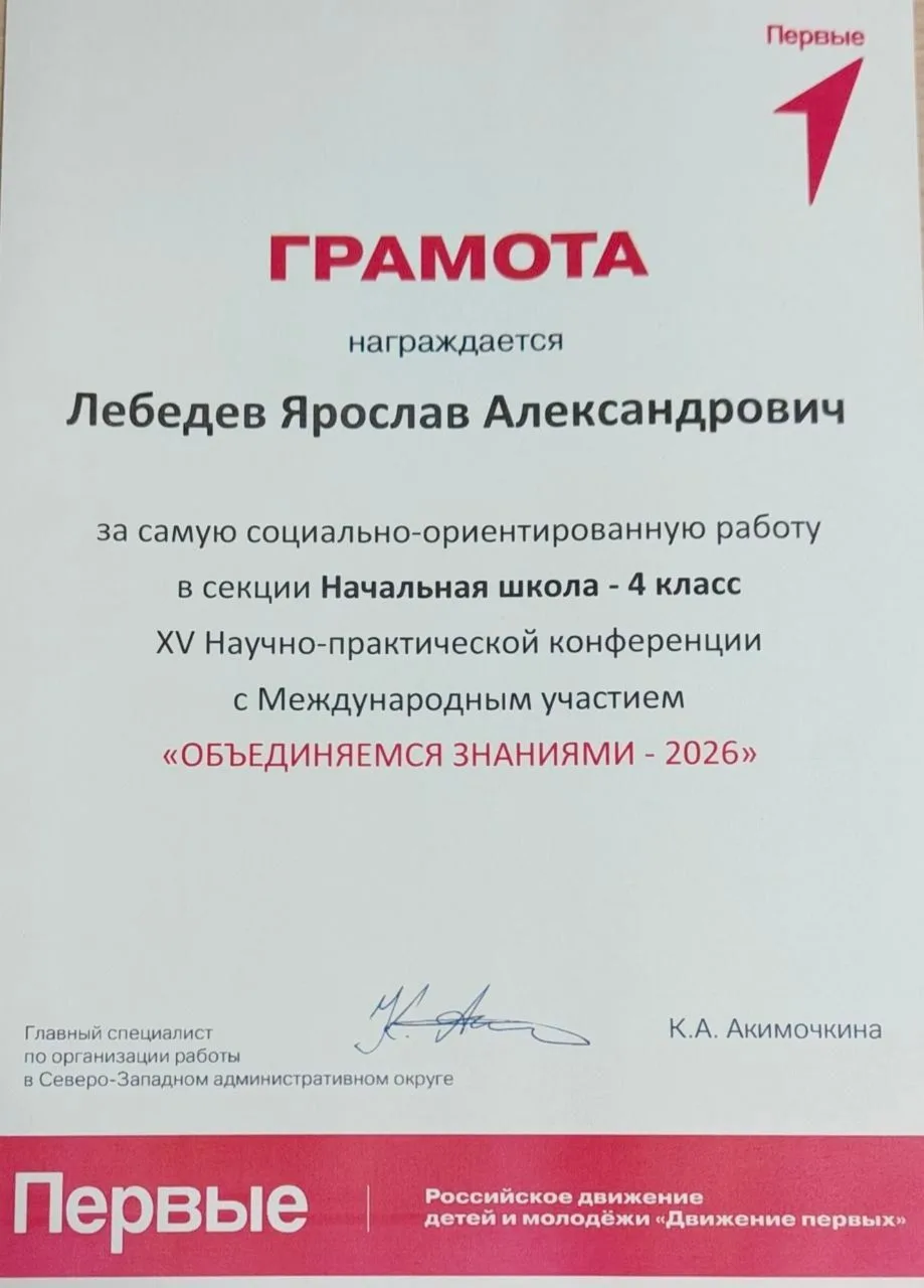 27 марта в школе №1517 (г. Москва) прошёл очный этап XV научно-практической конференции с международным участием «Объединяемся знаниями», на которой ученик 4А класса Лебедев Ярослав представил свой проект и получил награду в номинации от Общероссийского общественно-государственного движения детей и молодежи «Движение Первых» - "Самая социально-ориентированная работа".