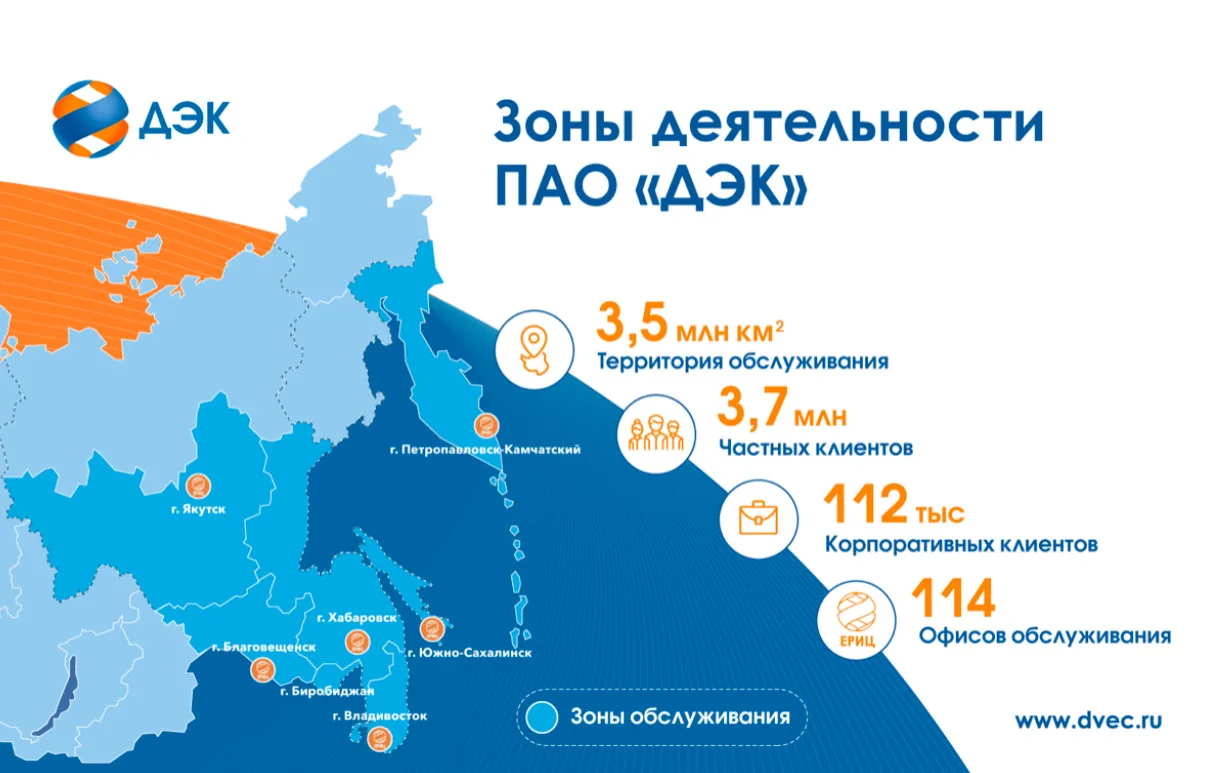 ДЭК – крупнейшая энергосбытовая компания России по территории: свыше 3,7 млн частных и 112 тыс. корпоративных клиентов в 114 офисах от Сахалина до Якутии. 🗺️