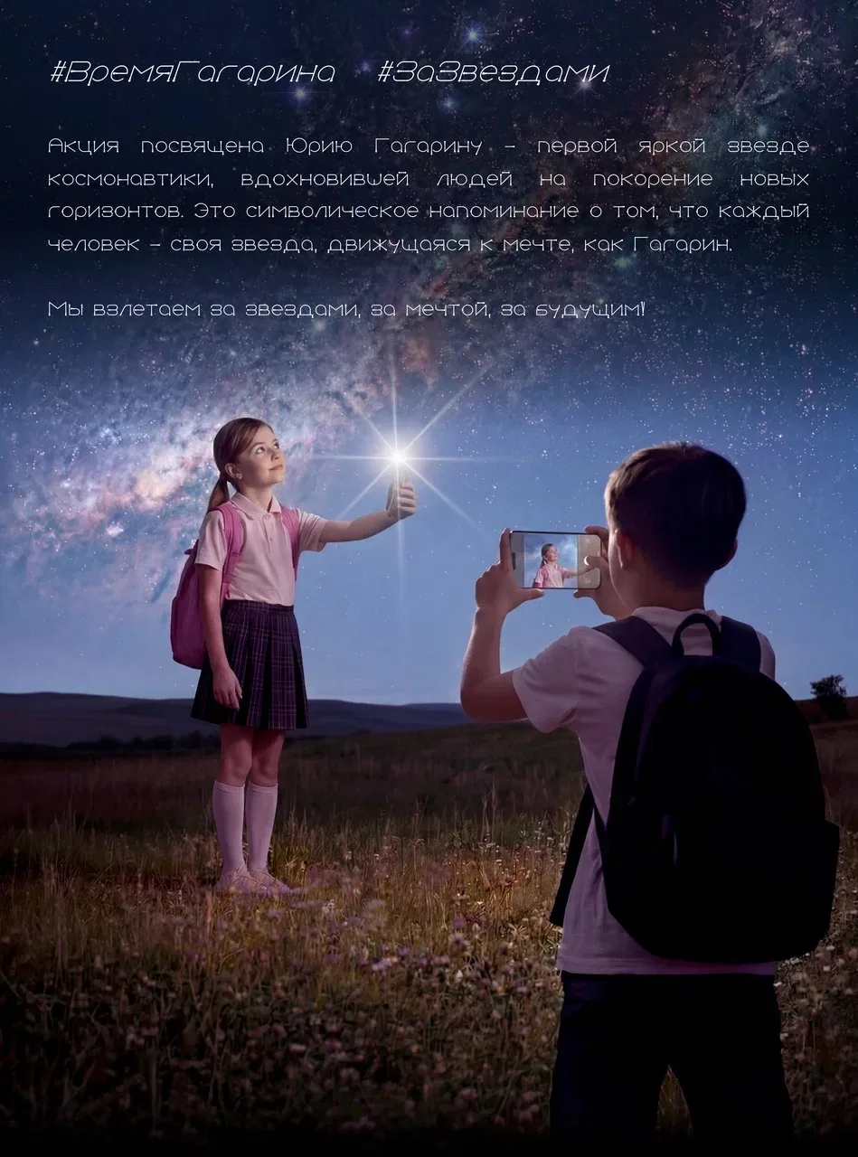 Приглашаем вас стать частью истории и присоединиться к нашему флешмобу #ВремяГагарина и #ЗаЗвёздами! 🌠 Продолжим дело первого человека в космосе — вдохновим других верить в свои мечты, так же, как Гагарин вдохновил весь мир!