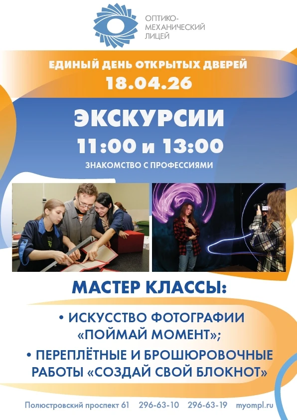 💥18 апреля Оптико-механический лицей приглашает учеников 8-11 классов и их родителей на Единый день открытых дверей.