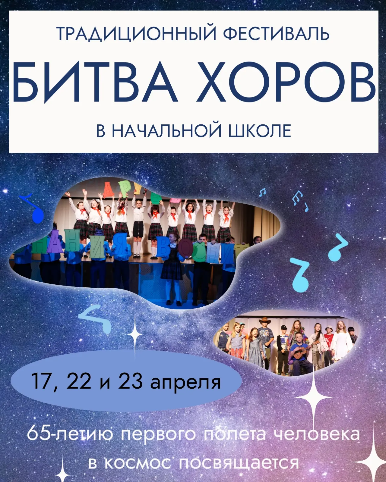 🎼 Уже завтра в нашей школе стартует традиционный фестиваль «Битва хоров»! В этом году он посвящён 65-летию первого полёта человека в космос.