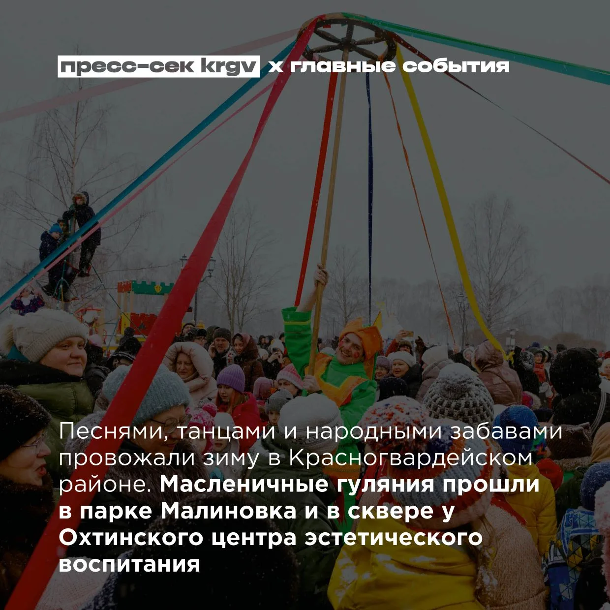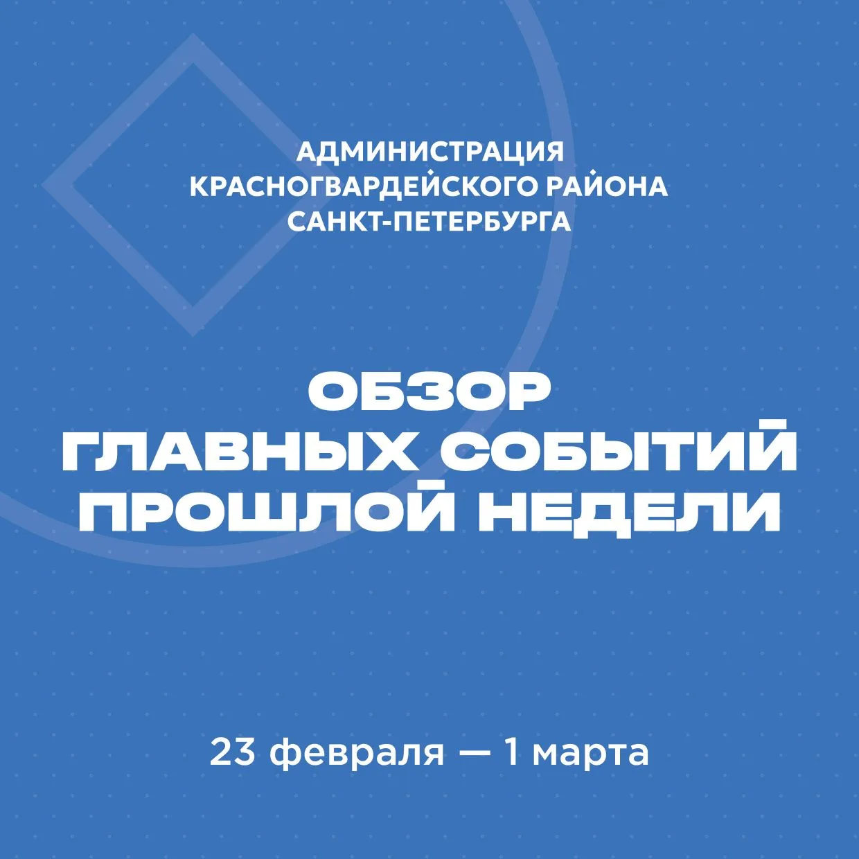 В Красногвардейском районе построят приют и клинику для животных, с начала нового учебного года откроются ещё 22 кадетских класса, завершился книжный фестиваль «Красногвардейский читающий», состоялись встреча с Героем России Максимом Шоломовым и профориентационный форум «Твоя среда», в Ржевском лесопарке прошёл лыжный этап краеведческого фестиваля, в парке Малиновка и сквере Охтинского центра эстетического воспитания — Масленичные гуляния.