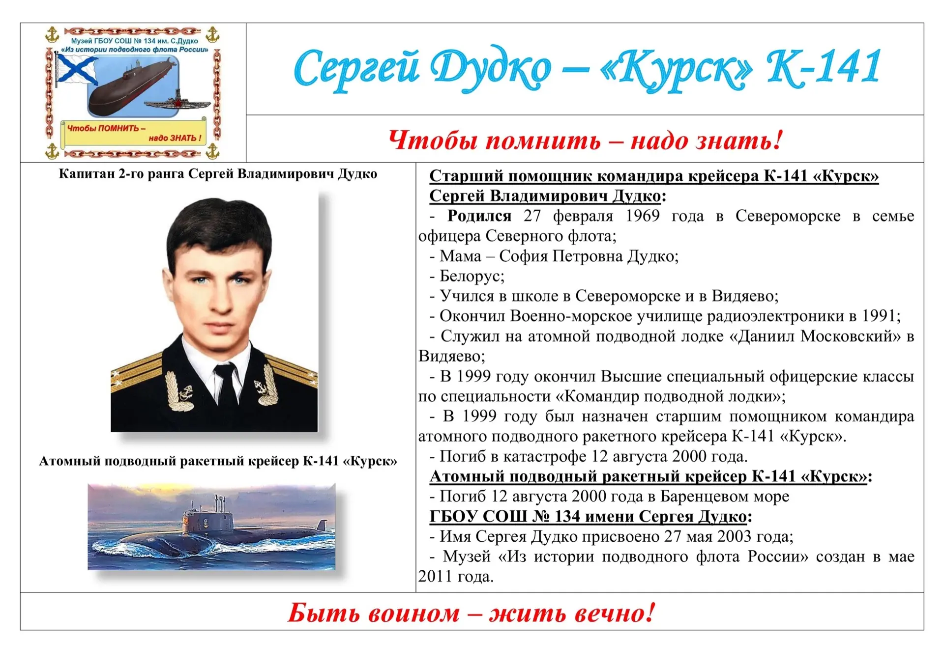 Событие символично состоялось в день рождения капитана II ранга, старшего помощника командира подводной лодки «Курск» Сергея Дудко. Его имя школа №134 носит с 2003 года.