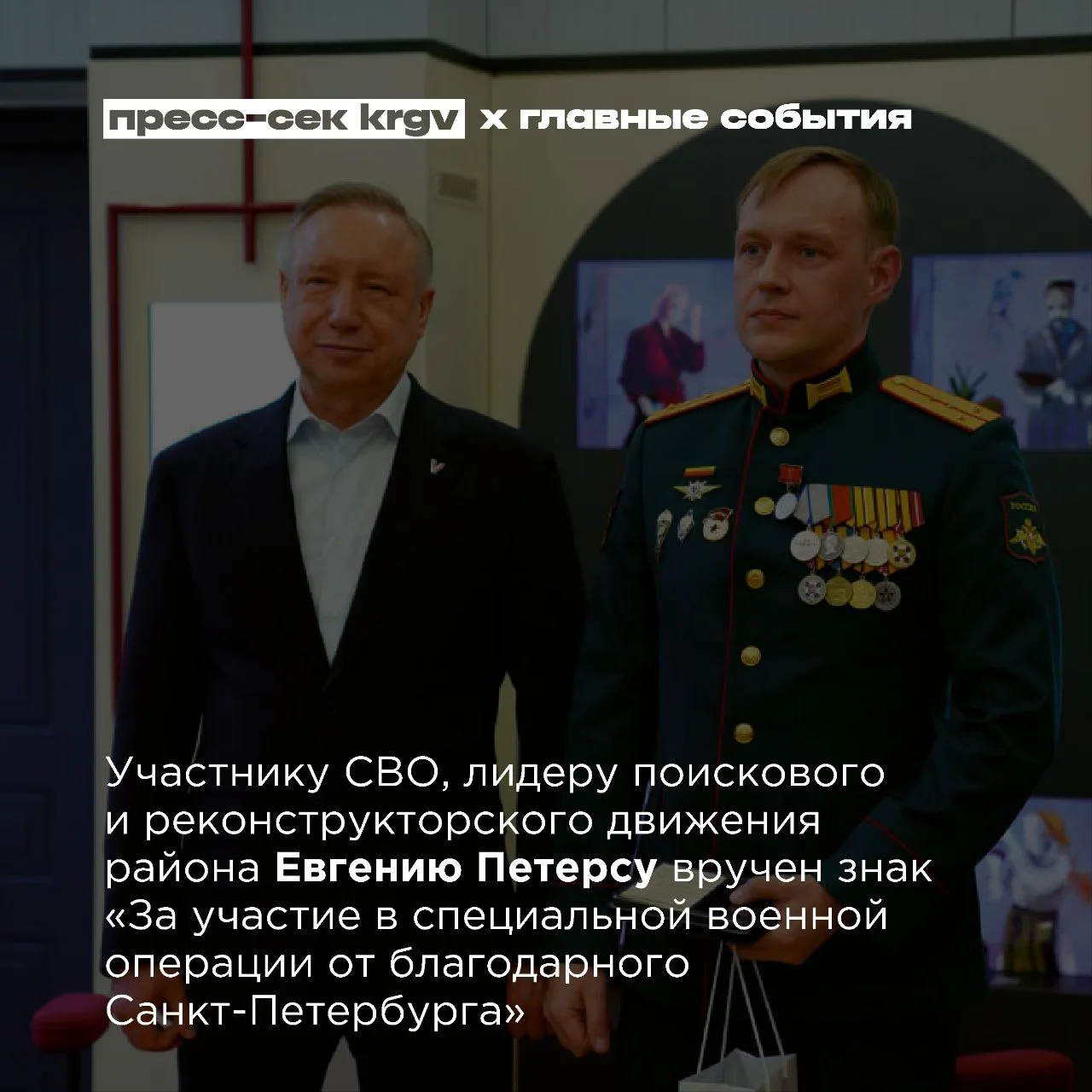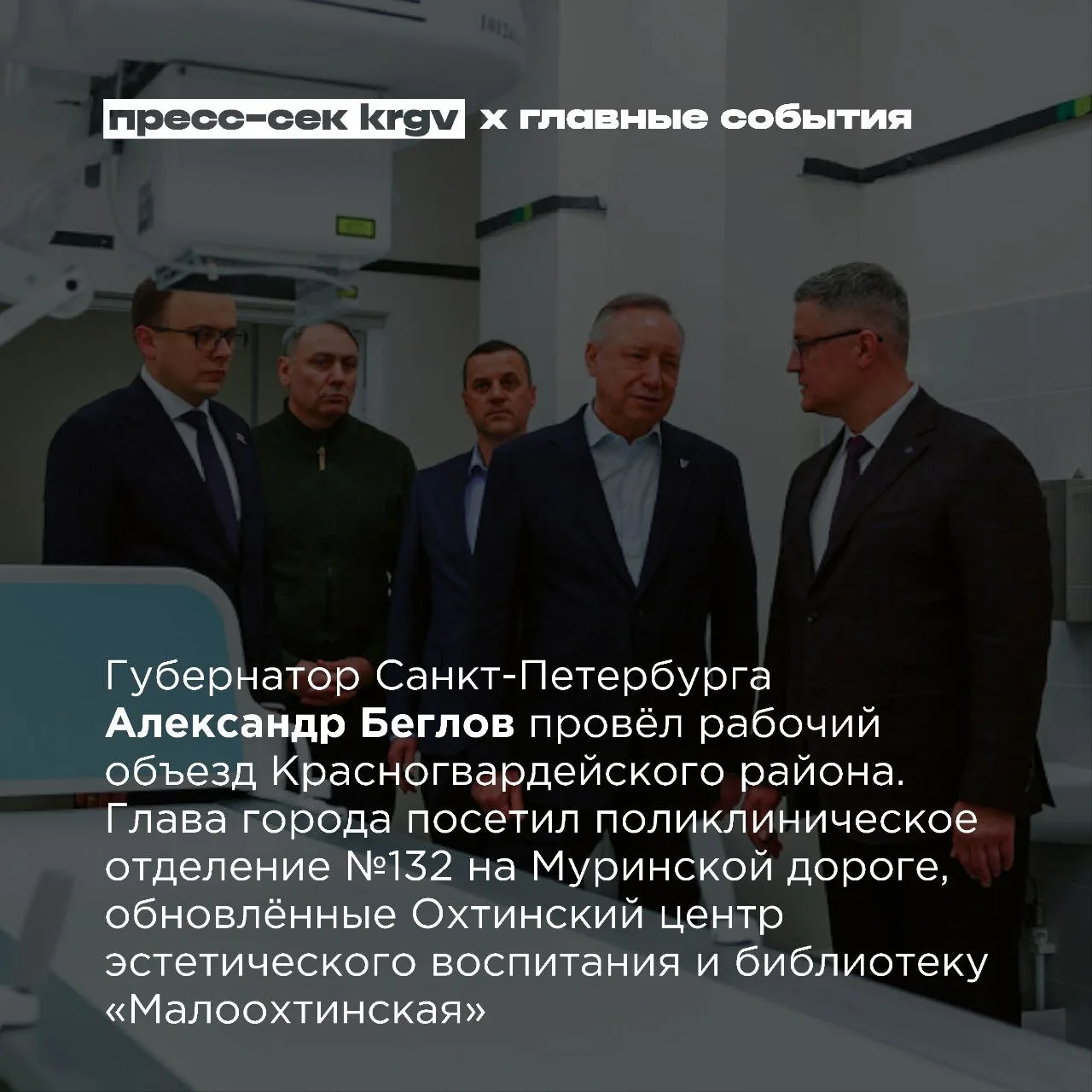 Губернатор Санкт-Петербурга Александр Беглов провёл рабочий объезд Красногвардейского района, состоялся отчёт главы района Андрея Хорта, в саду Милосердия открыли памятник погибшим от коронавирусной инфекции, пяти жителям Красногвардейского и лидеру поискового и реконструкторского движения Евгению Петерсу вручили знаки «За участие в специальной военной операции от благодарного Санкт-Петербурга», в библиотеке Гоголя прошёл фестиваль перед закрытием на реновацию, специалисты «Охтинки» организовали экскурсию для учеников школы №499
