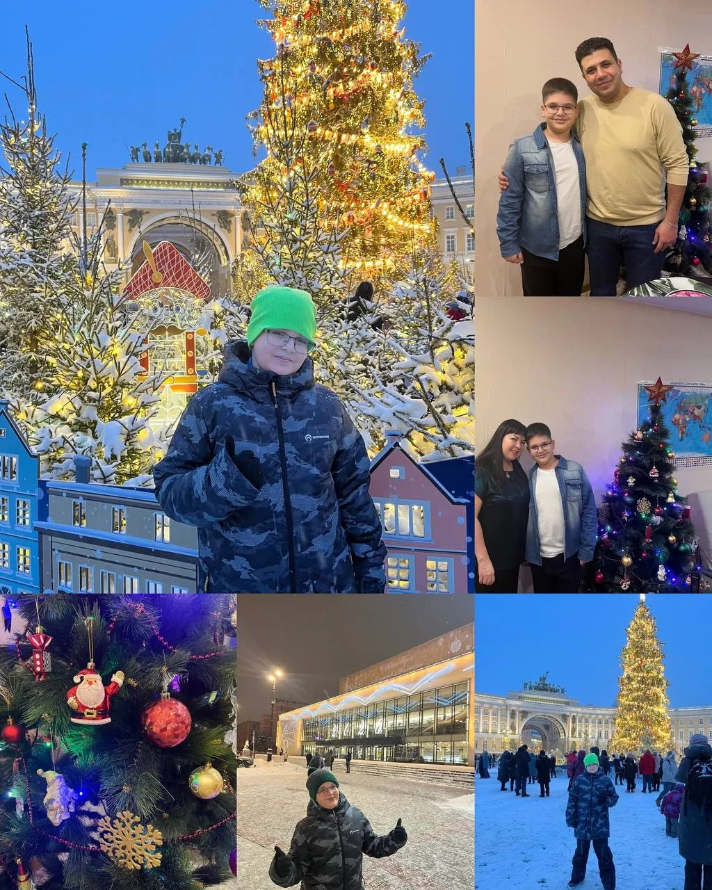 Новый год я встретил дома с мамой и папой🎄 В этом году я сам наряжал елку! В Новогоднюю ночь мы сидели за праздничным столом, потом ходили гулять на улицу. В начале января мы с мамой ездили на Дворцовую площадь и гуляли по праздничному городу!