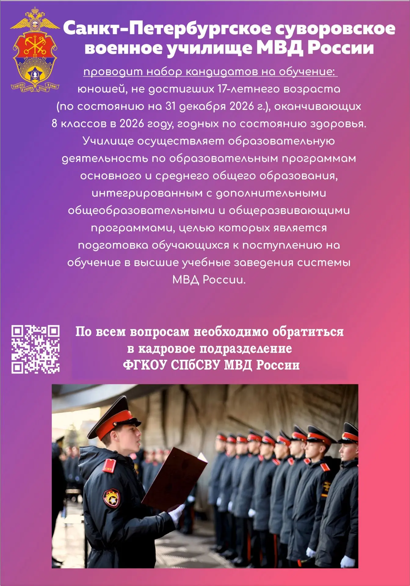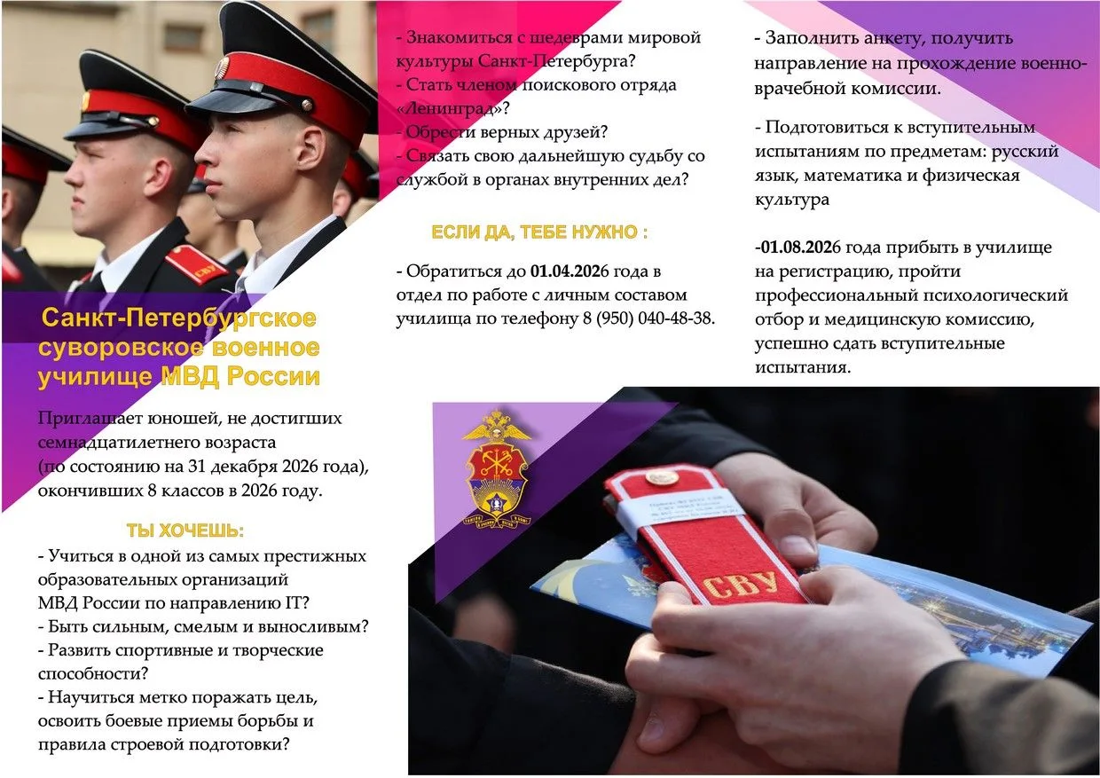 Санкт‑Петербургское суворовское военное училище МВД России приглашает юношей, оканчивающих в 2026 году 8 классов.
