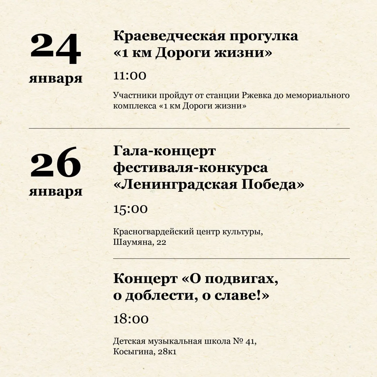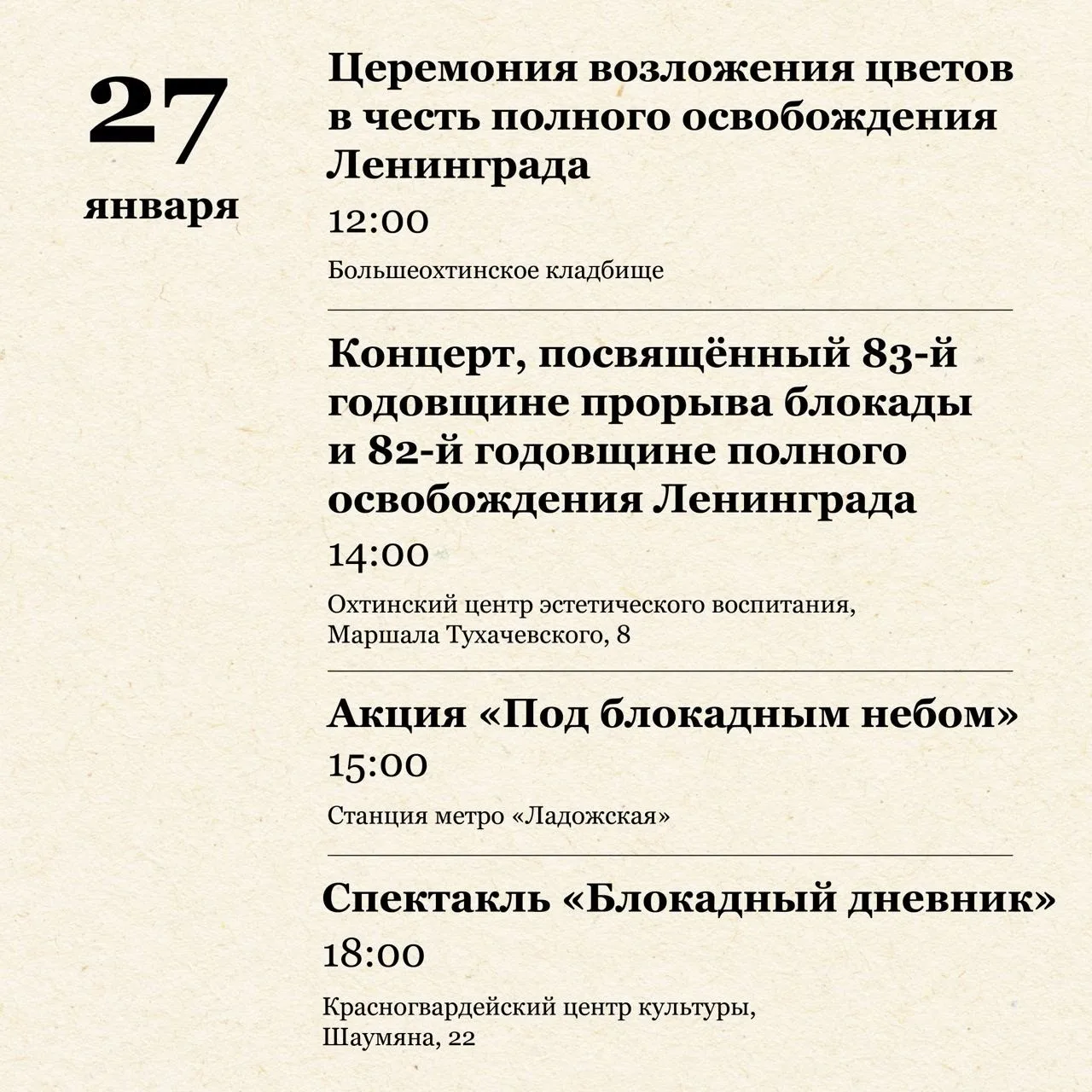🔹27 января в 15:00 — пойти на концерт в честь освобождения Ленинграда в Охтинский центр эстетического воспитания