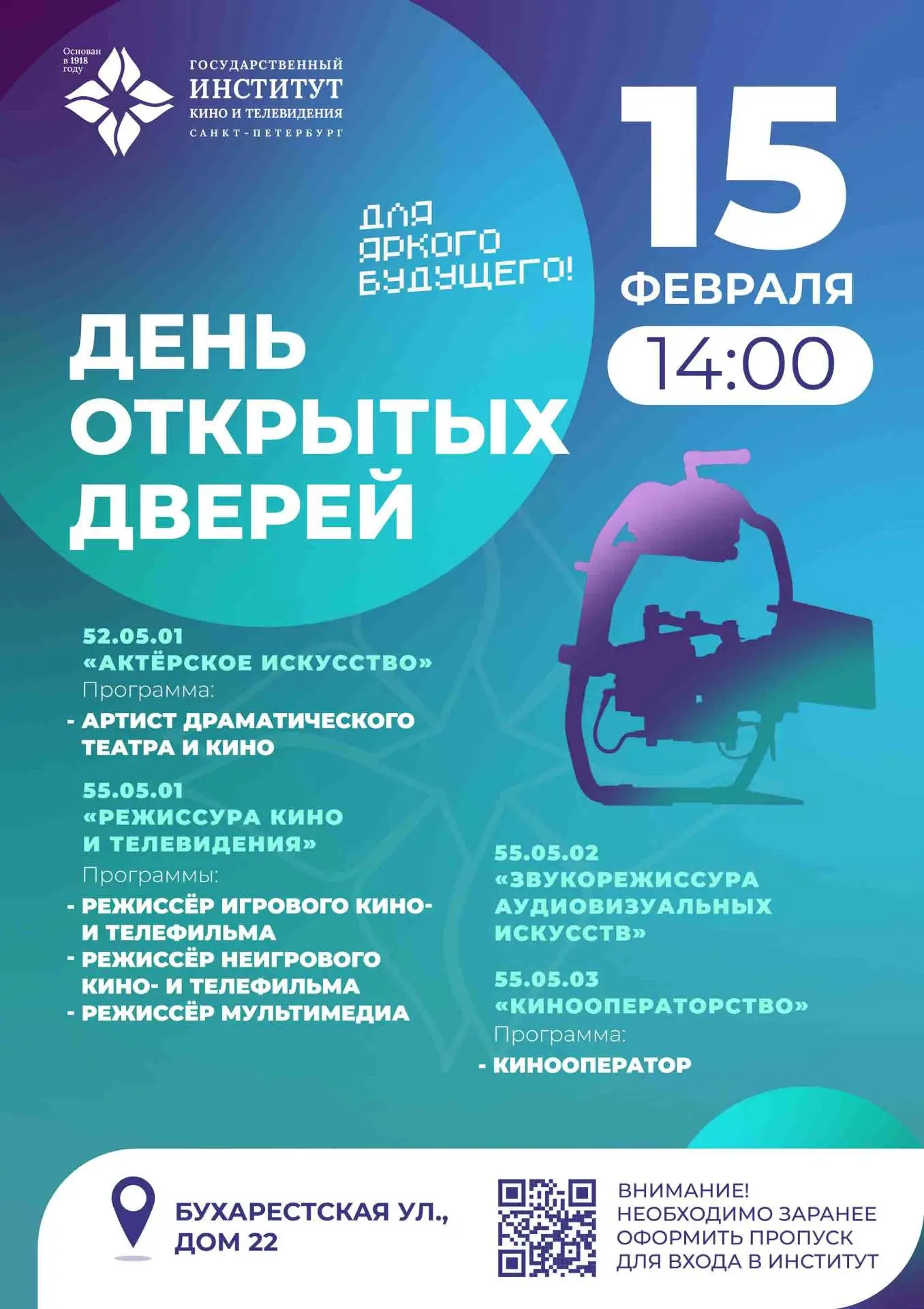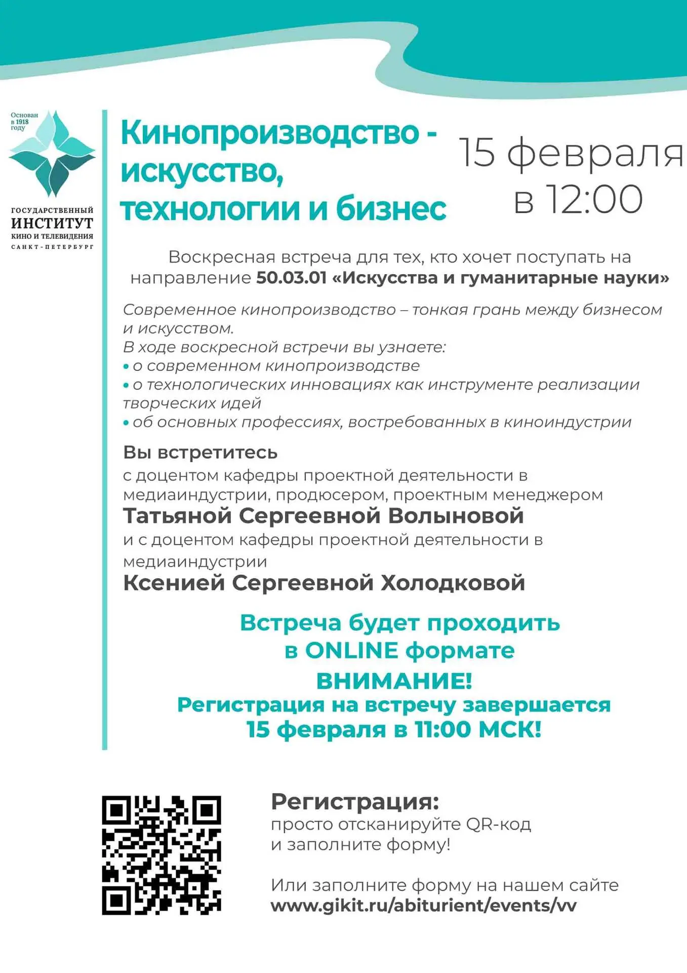 Санкт-Петербургский государственный институт кино и телевидения приглашает абитуриентов на Воскресные встречи и День открытых дверей!