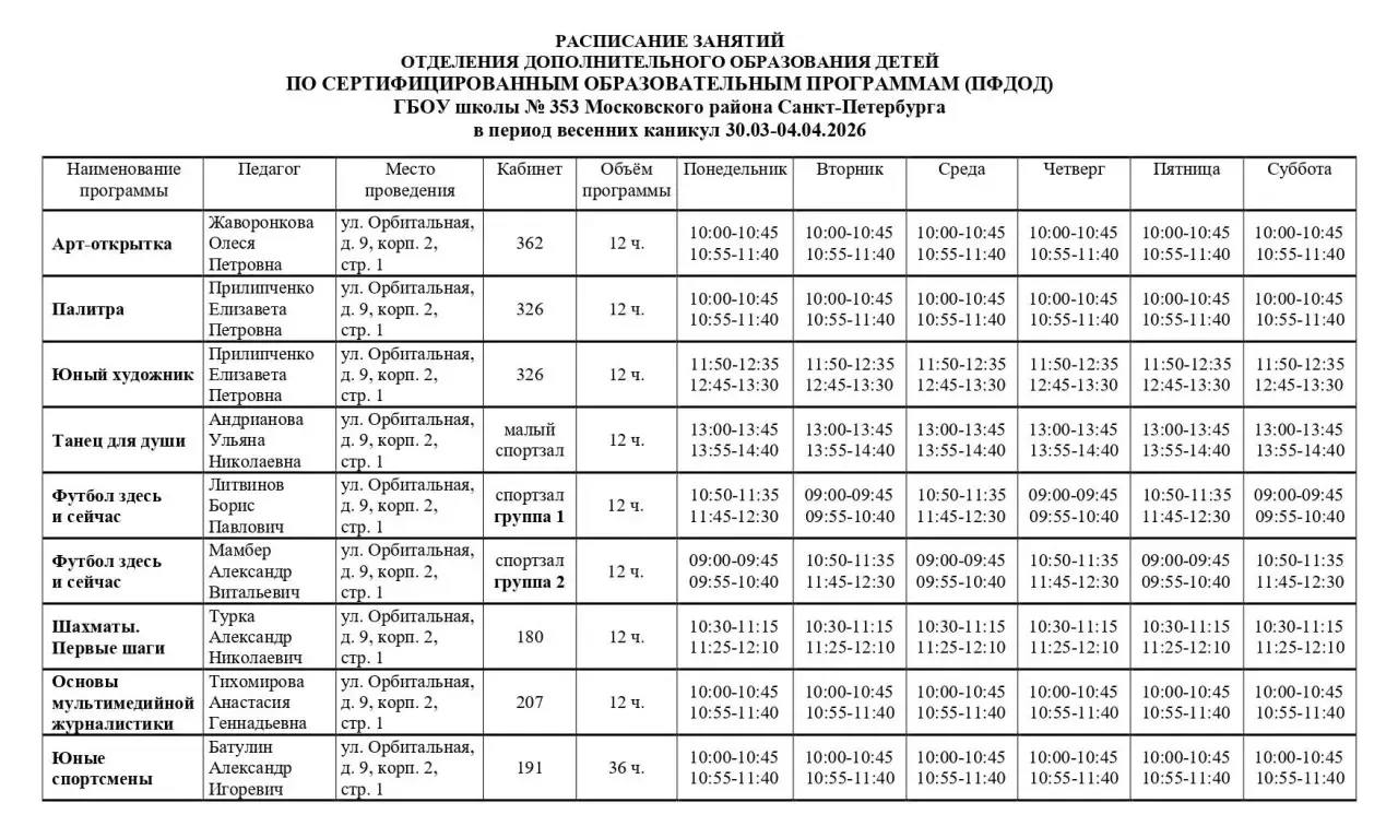 Публикуем расписание кружков на весенних каникулах! 🌷