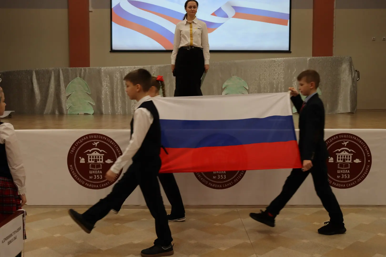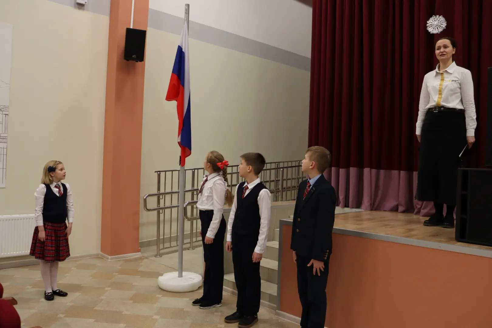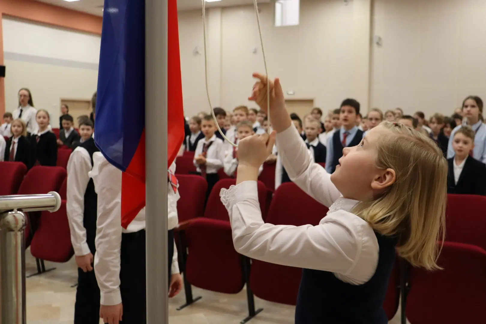 Торжественно вынесла флаг знаменная группа 4В класса, а почетное право поднять Государственный флаг предоставилось отличнице 3Б класса Автуховой Веронике 👏🏻