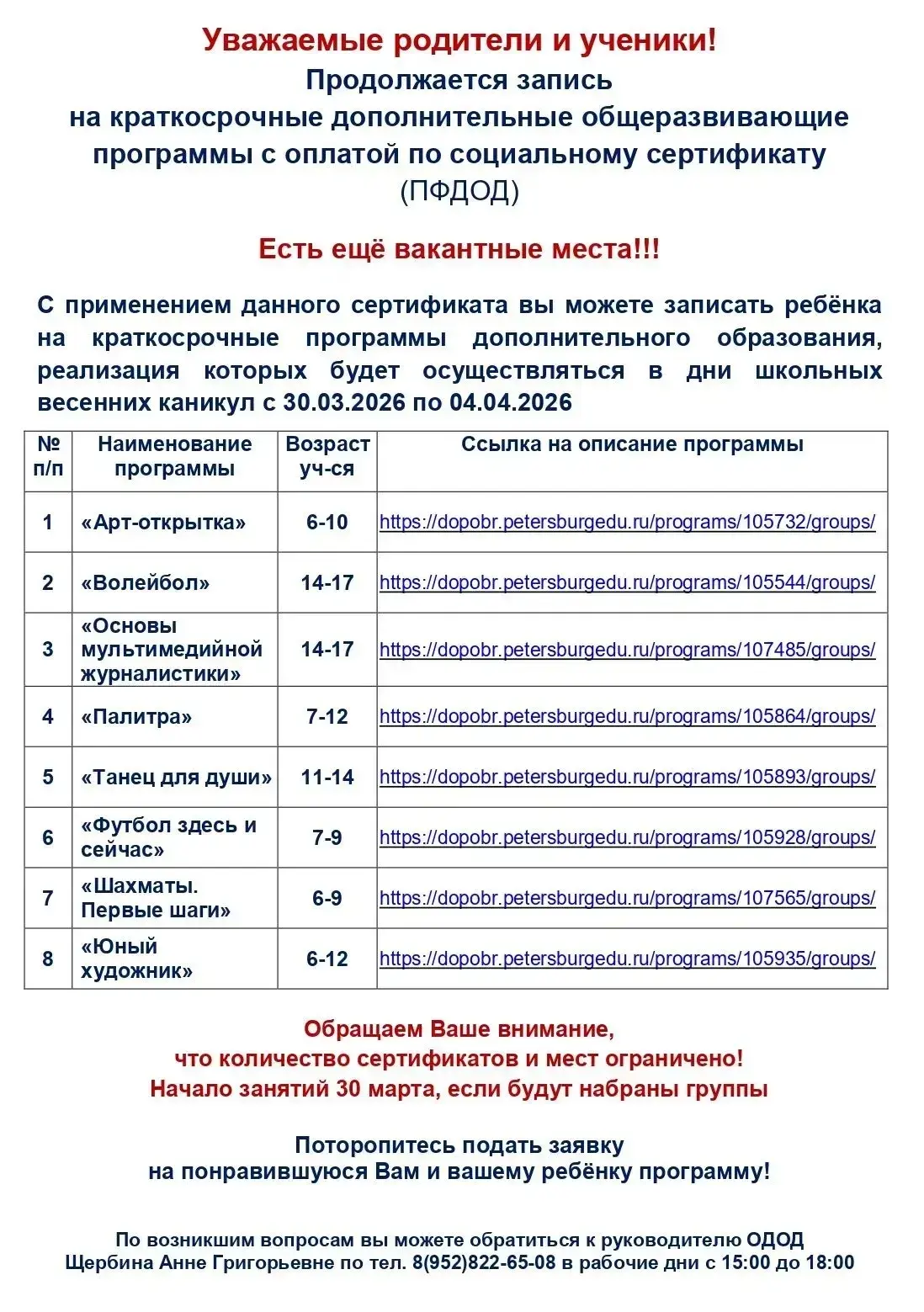 С применением данного сертификата вы можете записать ребёнка на краткосрочные программы дополнительного образования, реализация которых будет осуществляться в дни школьных весенних каникул с 30.03.2026 по 04.04.2026