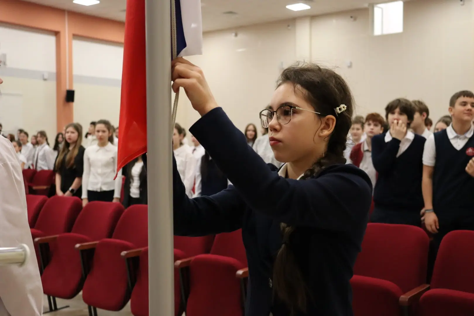 Торжественно вынесла флаг знаменная группа 9А класса, а почетное право поднять Государственный флаг предоставилось советнику директора по воспитанию Храбуновой Марии Владимировне 👏🏻