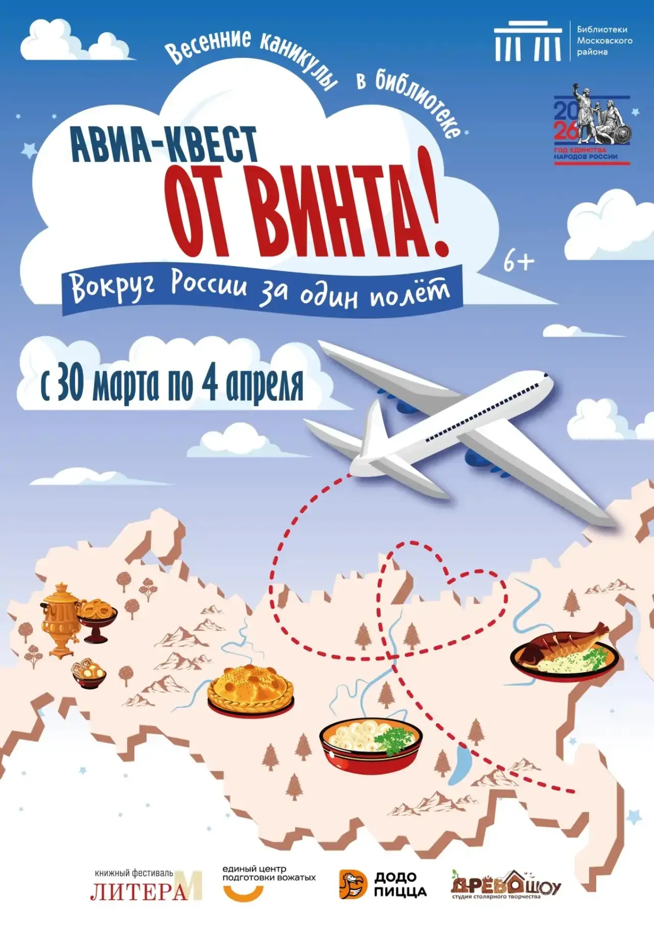 Приглашаем школьников и их родителей на авиа-квест «От винта! Вокруг России за один полет» с 30 марта по 4 апреля. Ребята поднимутся на борт воображаемого лайнера и отправятся в авиапутешествие по самым разным регионам России.