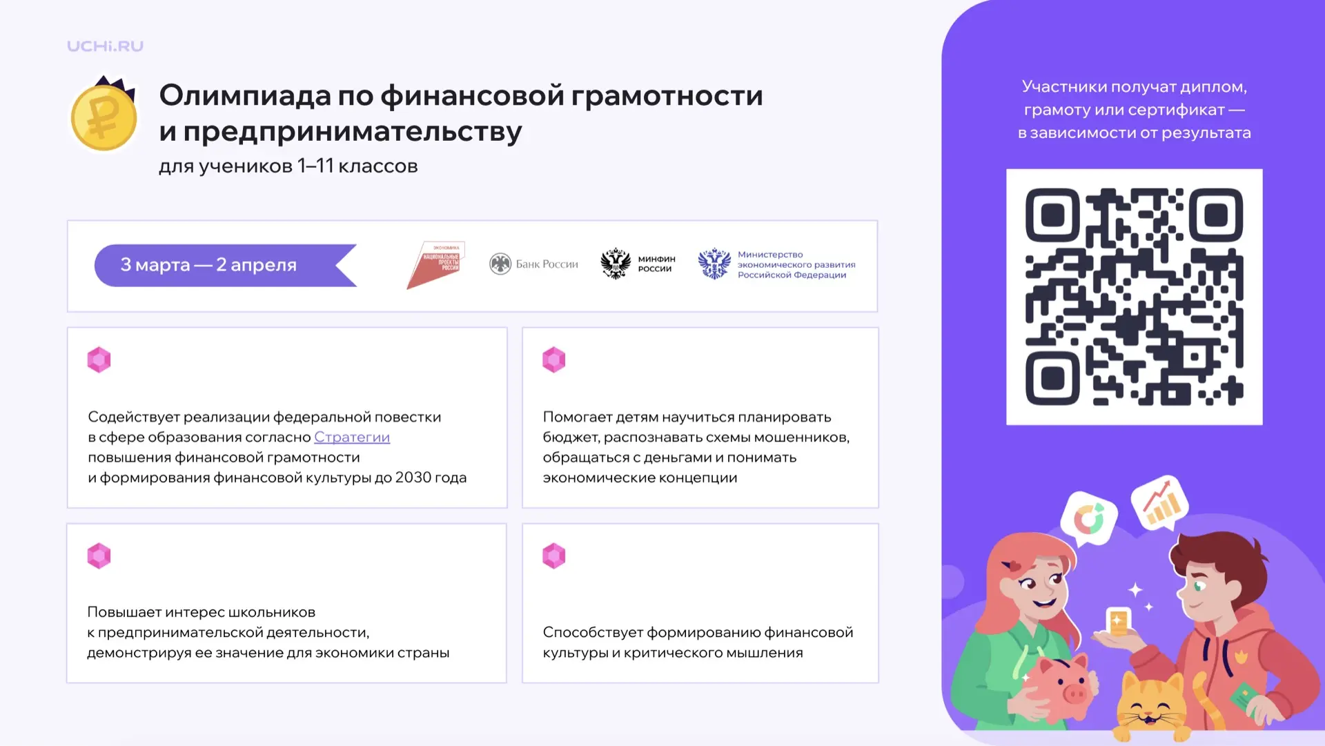 На Учи.ру стартовала бесплатная всероссийская онлайн-олимпиада по финансовой грамотности и предпринимательству для дошкольников и учащихся 1–11 классов. Партнеры состязания — Банк России, Министерство финансов Российской Федерации и Министерство экономического развития Российской Федерации.