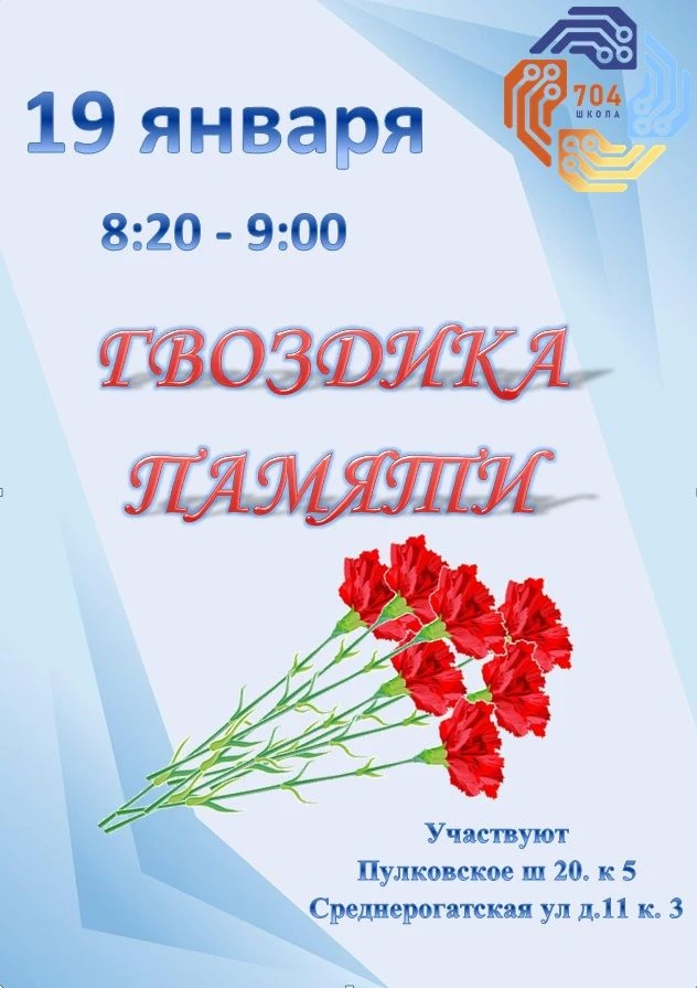 19 января, в понедельник в здании 1 классов (200 мест), и в здании старшей школы (550 мест) будет проведена акция "Гвоздика Памяти", посвященная этой знаменательной для нашего города дате.
