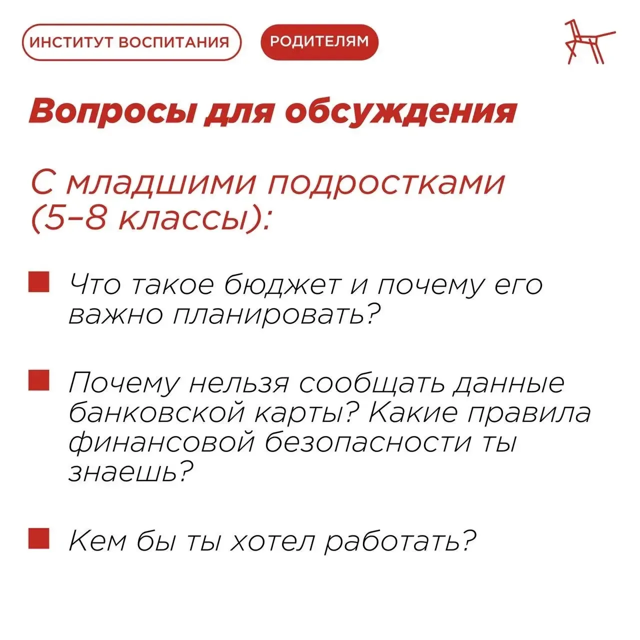 🌕Эксперты Института воспитания подготовили ряд вопросов для детей и подростков, чтобы помочь им понять, как функционируют деньги и как они используются.