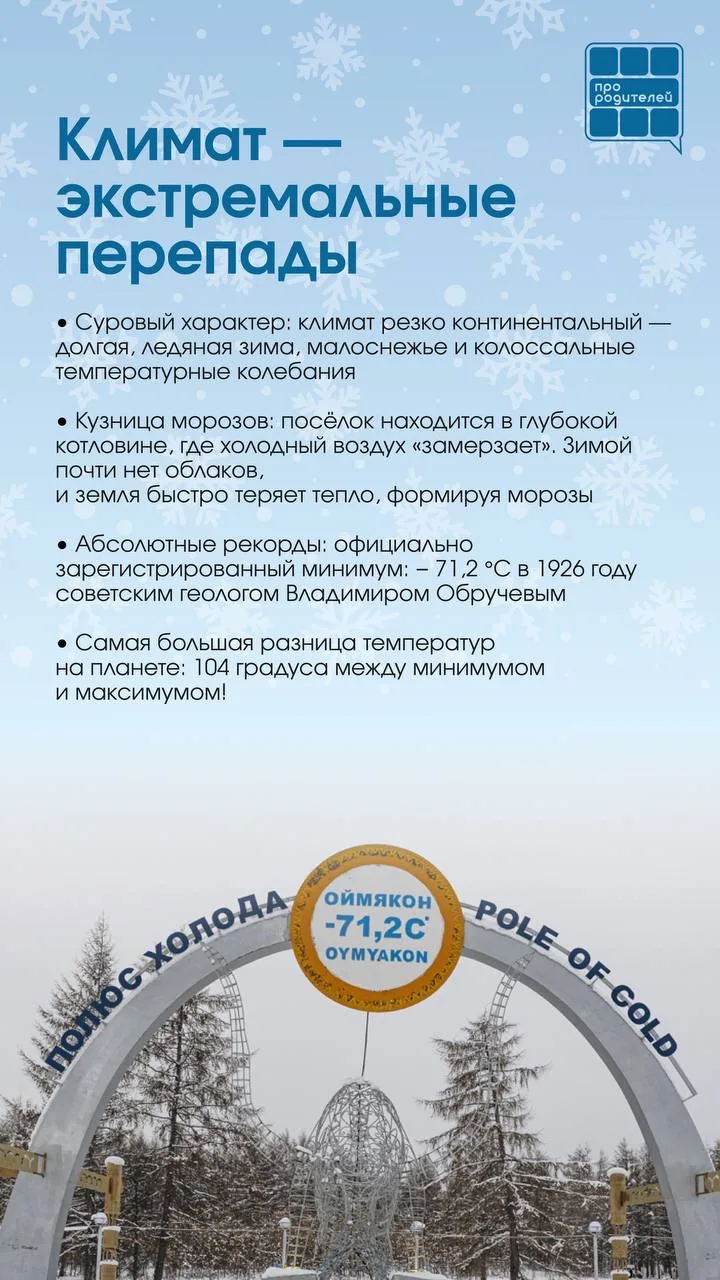 ❄️ Представьте: термометры здесь нередко показывают ниже -50°C, а абсолютный рекорд зафиксирован на отметке -71,2°C! Оймякон — это место, где жизнь идет своим чередом, бросая вызов самым экстремальным условиям.