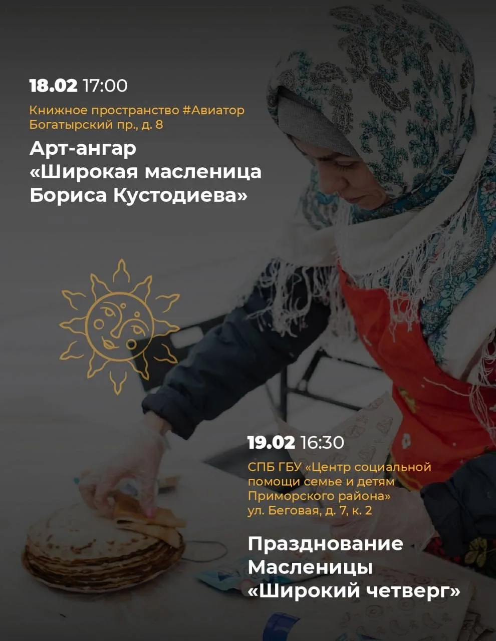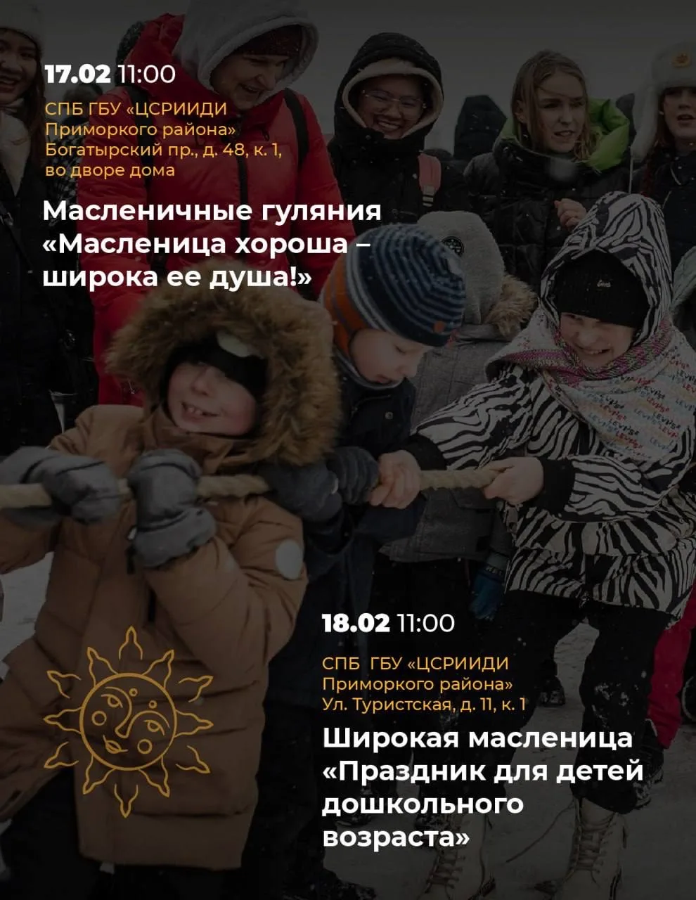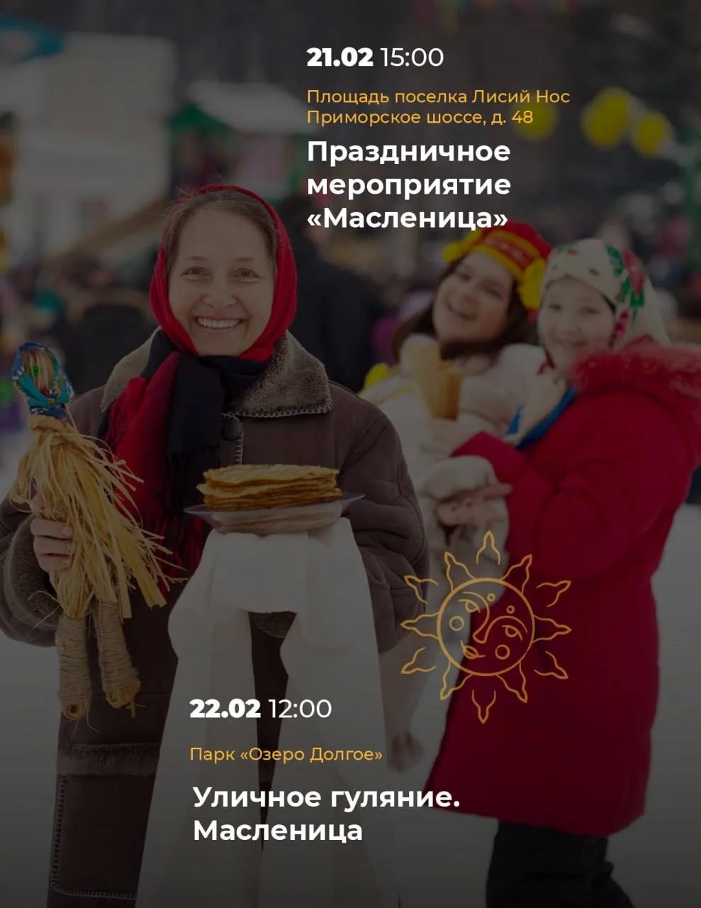 С 16 по 22 февраля в Приморском районе пройдут яркие проводы зимы. На разных площадках оживут старинные традиции, прозвучит народная музыка, а в воздухе будет витать аромат румяных блинов.