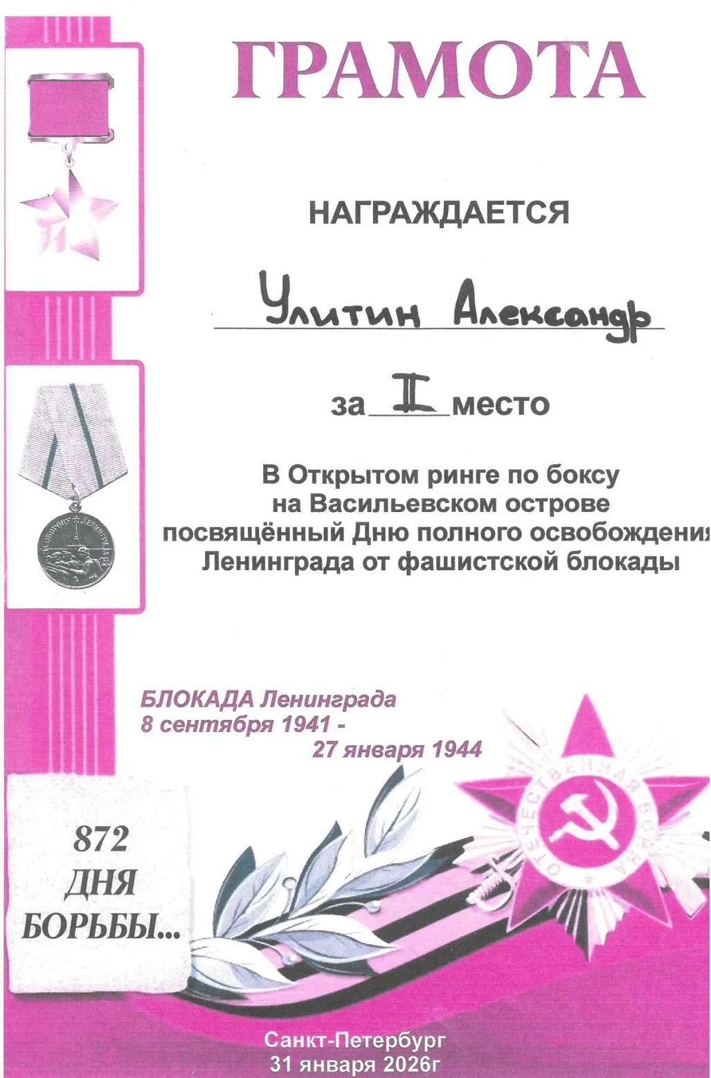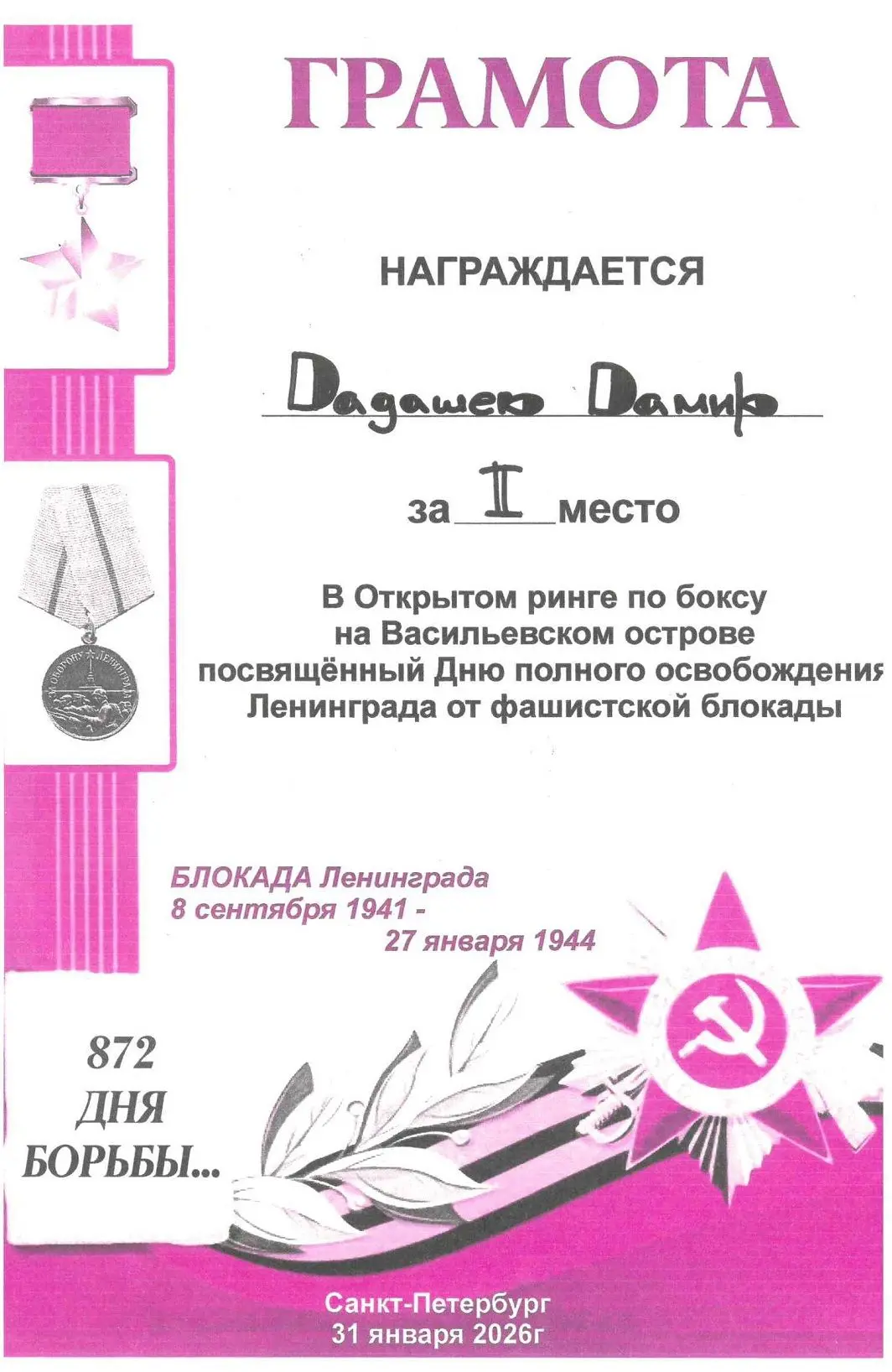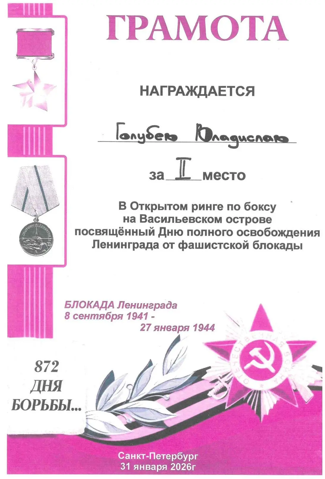 31 января 2026 г прошли городские соревнования по боксу «Открытый ринг Васильевского острова», посвященные Дню полного освобождения Ленинграда от фашисткой блокады, в которых участвовали наши спортсмены из объединения «Бокс». Поздравляем победителей – Адодина Давида, Абдыкадырова Даниэля, Эшонова Рустама, Карежева Дамира, за 2 место - Голубева Владислава, Улитина Александра, Дадашева Дамира! Поздравляем с отличной подготовкой учащихся руководителя объединения Т.З. Атакишиева!