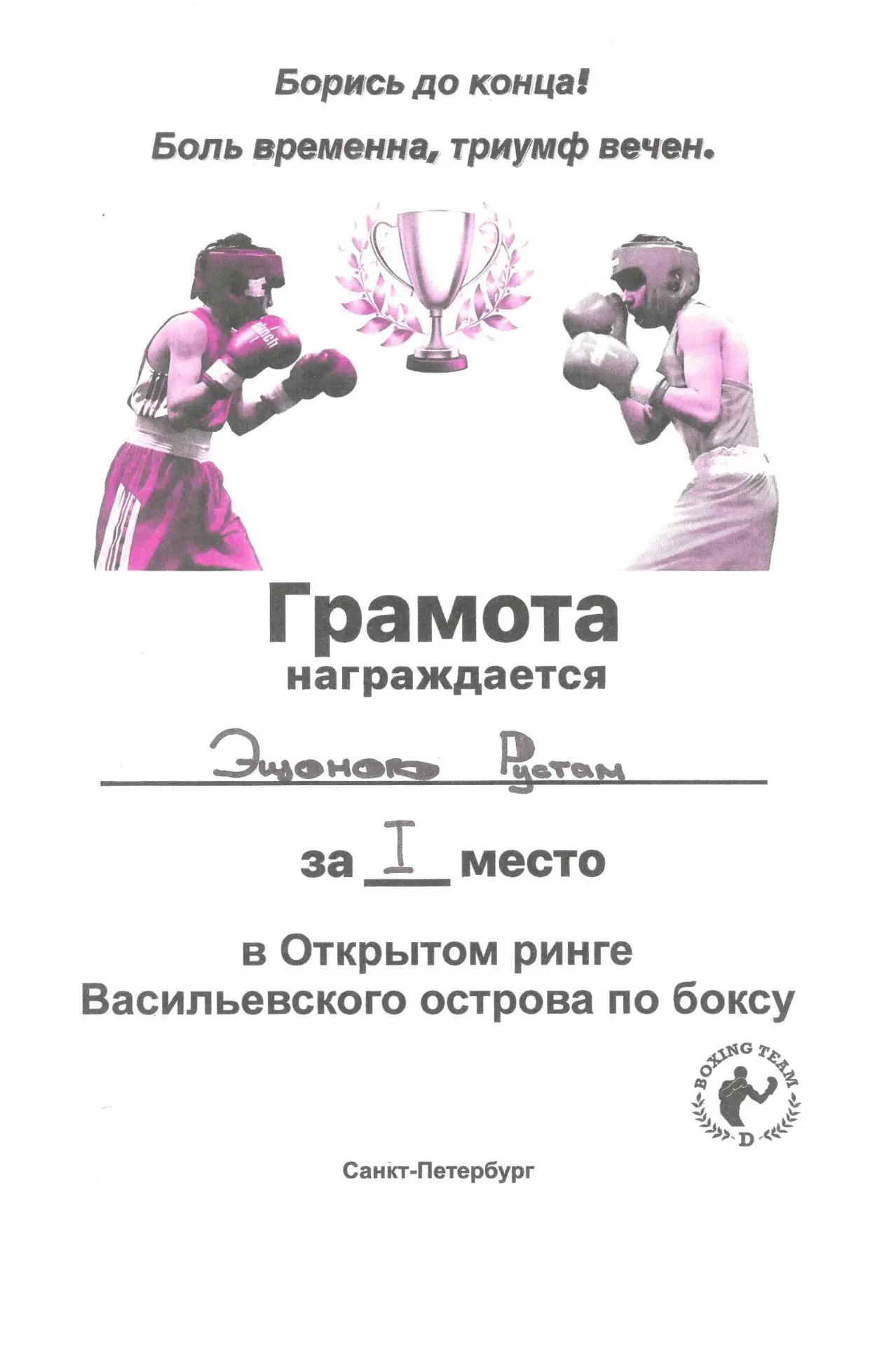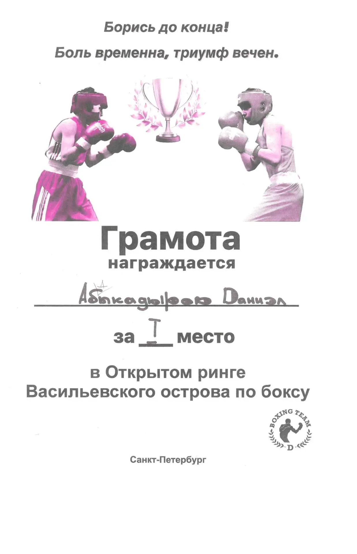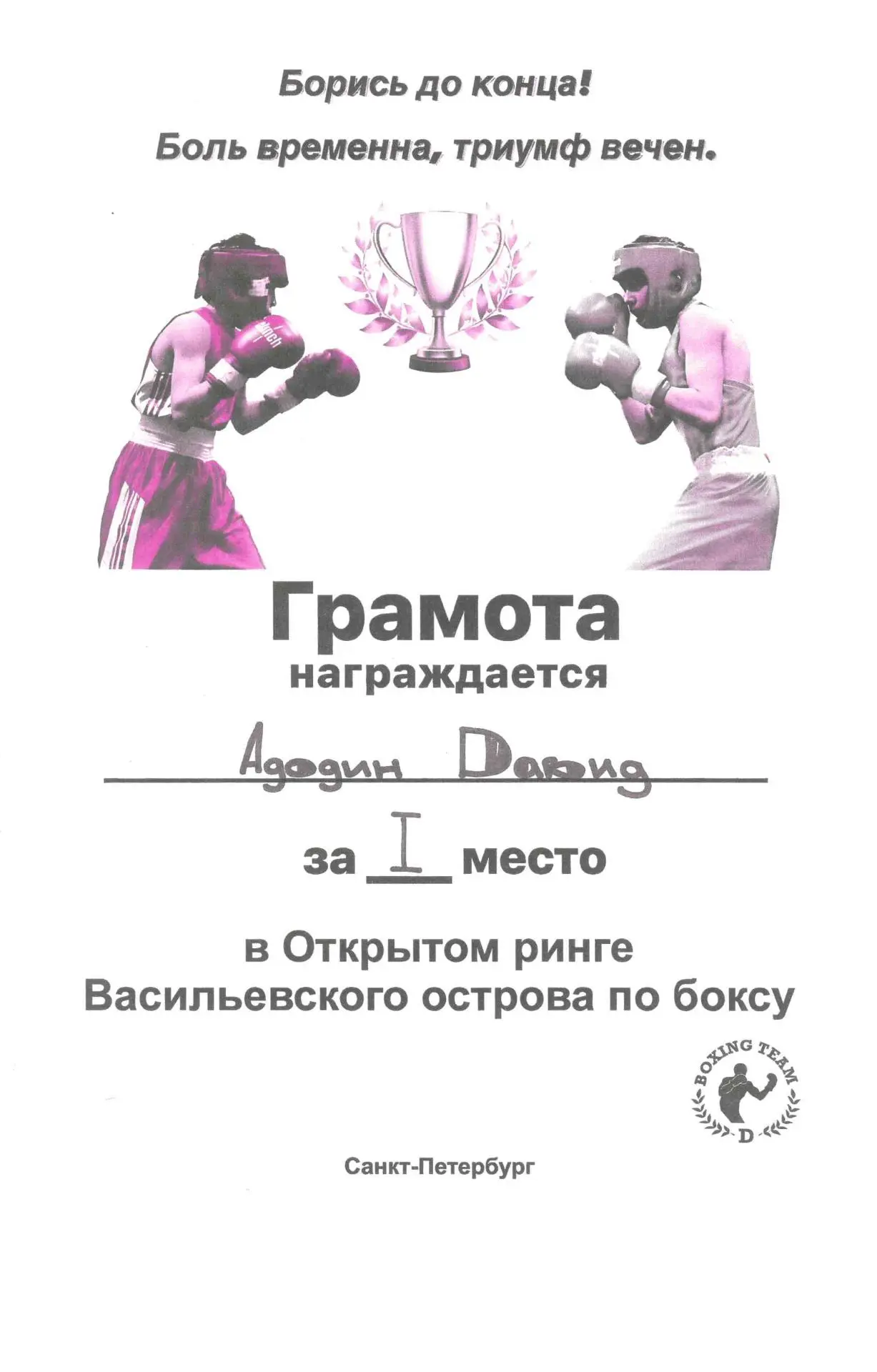 31 января 2026 г прошли городские соревнования по боксу «Открытый ринг Васильевского острова», посвященные Дню полного освобождения Ленинграда от фашисткой блокады, в которых участвовали наши спортсмены из объединения «Бокс». Поздравляем победителей – Адодина Давида, Абдыкадырова Даниэля, Эшонова Рустама, Карежева Дамира, за 2 место - Голубева Владислава, Улитина Александра, Дадашева Дамира! Поздравляем с отличной подготовкой учащихся руководителя объединения Т.З. Атакишиева!