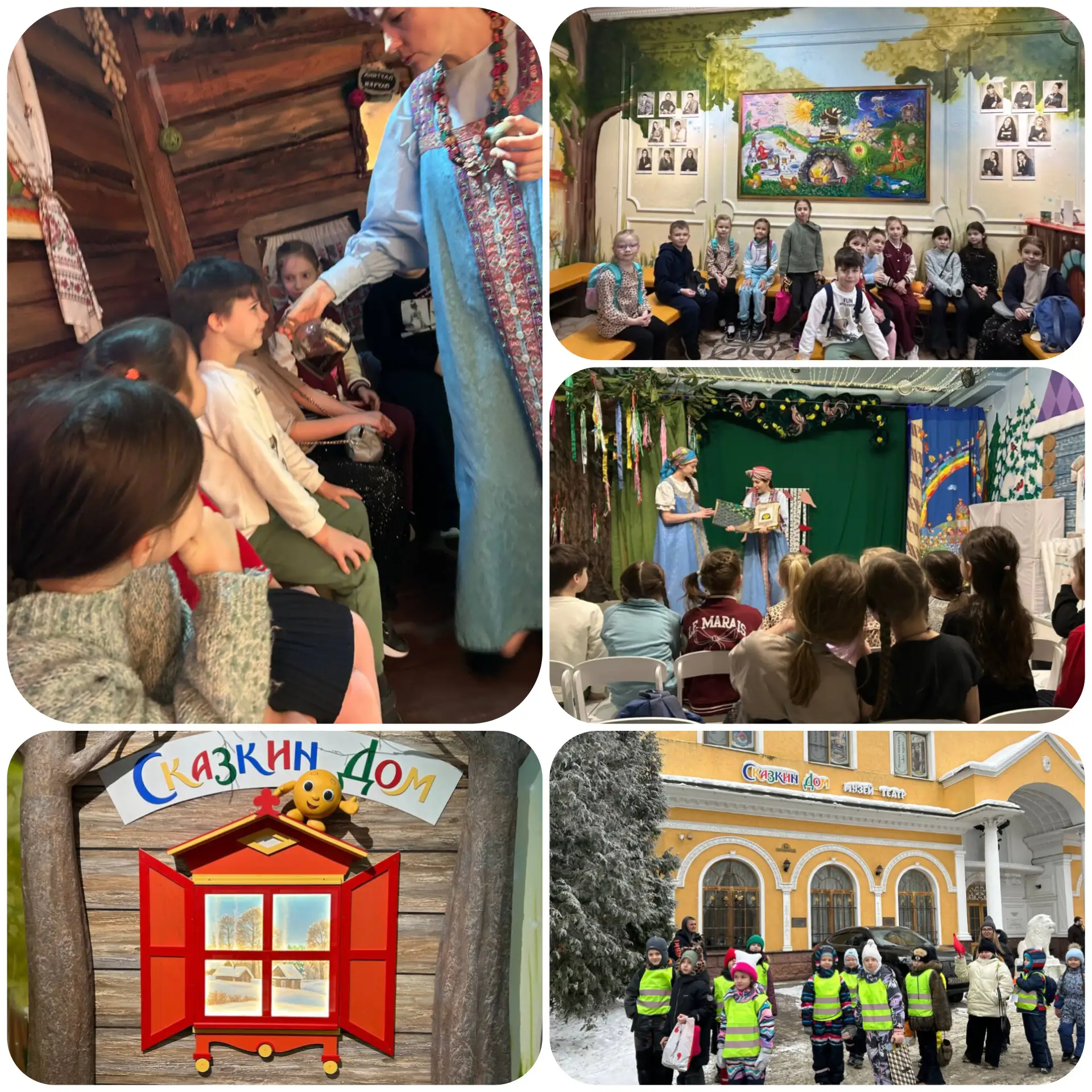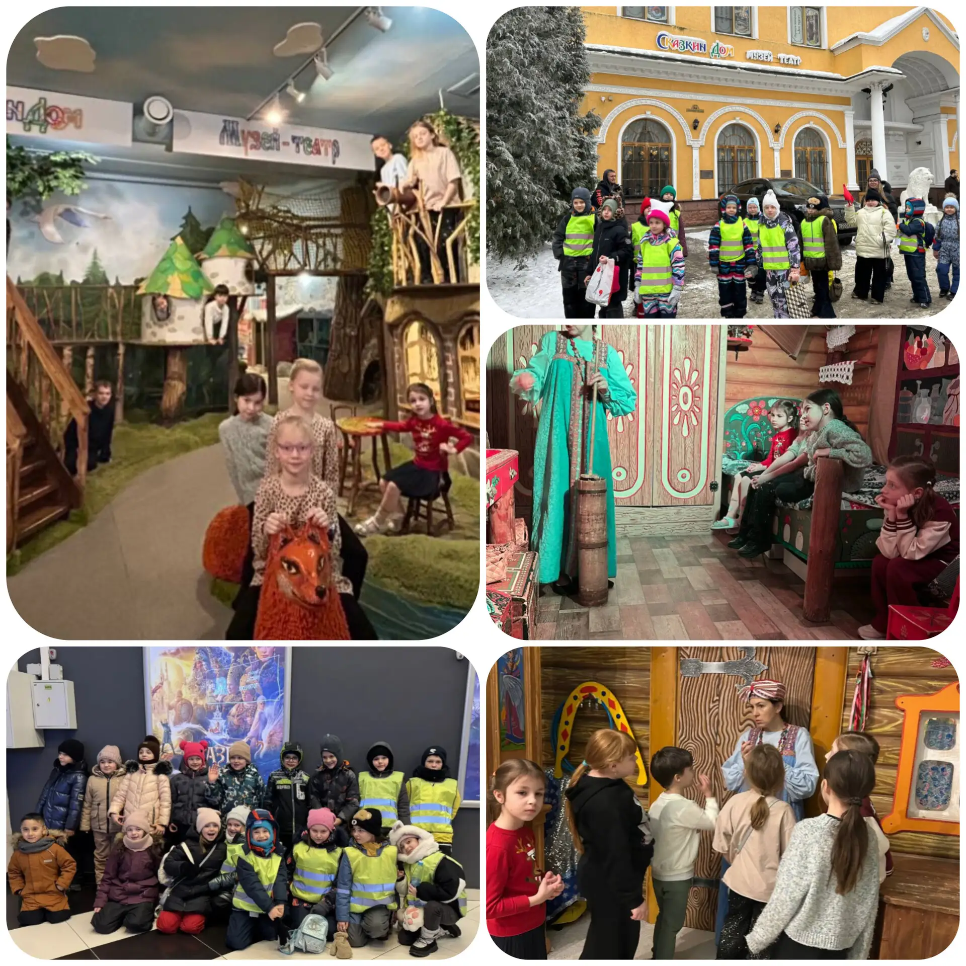 1а 1б классы посетили интерактивный детский театр «Сказкин дом». Наше путешествие началось с домика Бабы Яги, избушки на курьих ножках. Мы рассмотрели и потрогали её вещи,понюхали баночки с приворотными зельями,заглянули в погреб и даже через её печку попали в другие сказки. В гостях у 3-х Медведей увидели настоящие лапти, поиграли на гуслях и отдохнули на кроватях главных героев. В тереме у Мороза Ивановича нашли целую коллекцию кривых зеркал, а во дворце у Кощея Бессмертного узнали его «главную тайну».