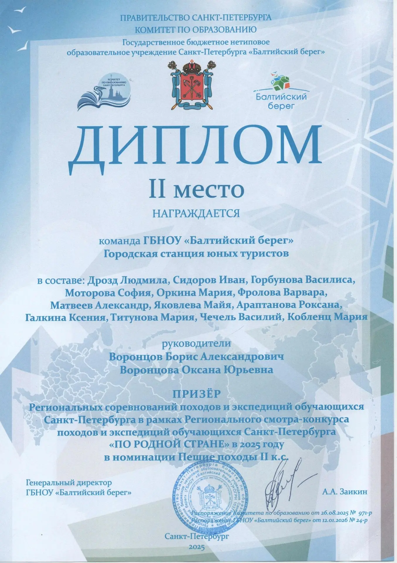 Лучшие в своих номинациях получили дипломы городского комитета по образованию и ценные призы. Среди показавших отличные результаты учащиеся нашего объединения «Пешеходный туризм», которые были награждены Дипломом за 2 место в номинации « Пешие походы II к.с.». Поздравляем наших ребят и их руководителей Воронцову О.Ю. и Воронцова Б.А.!