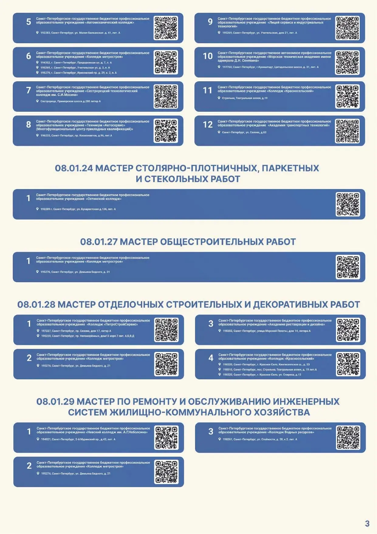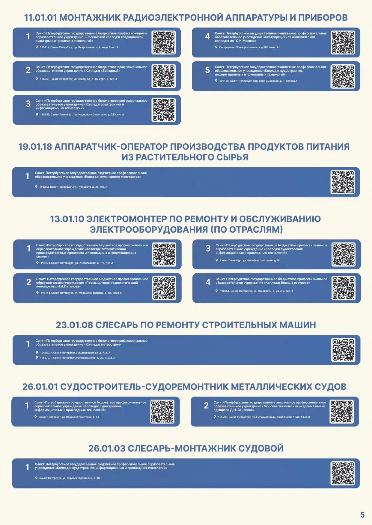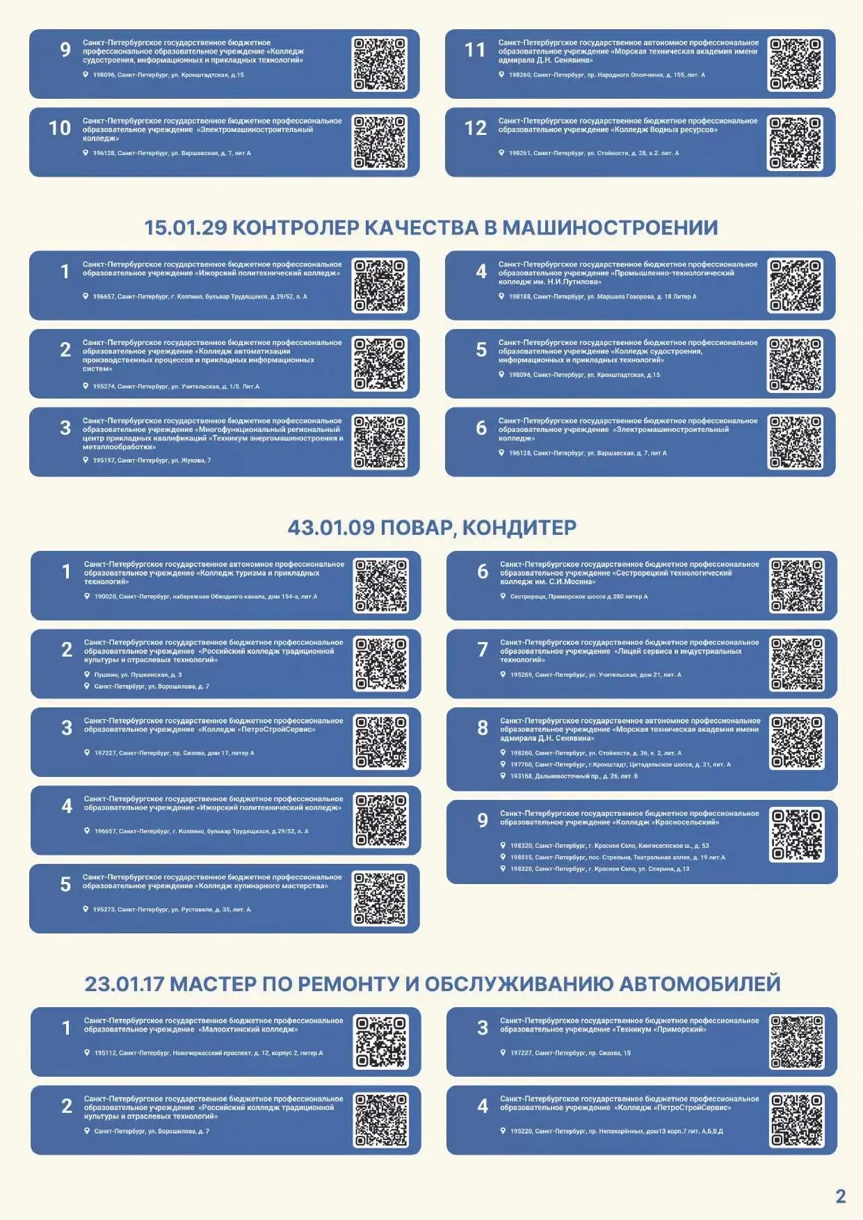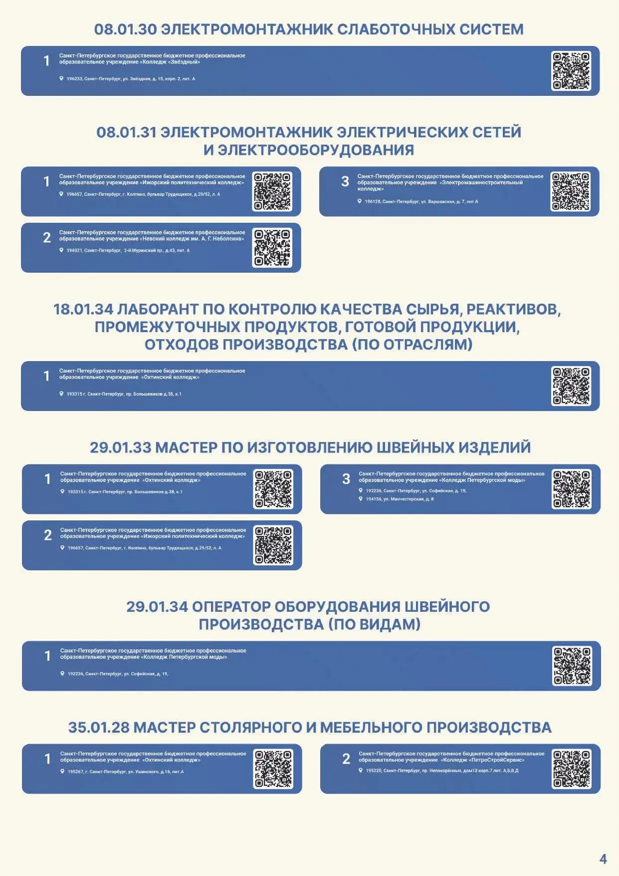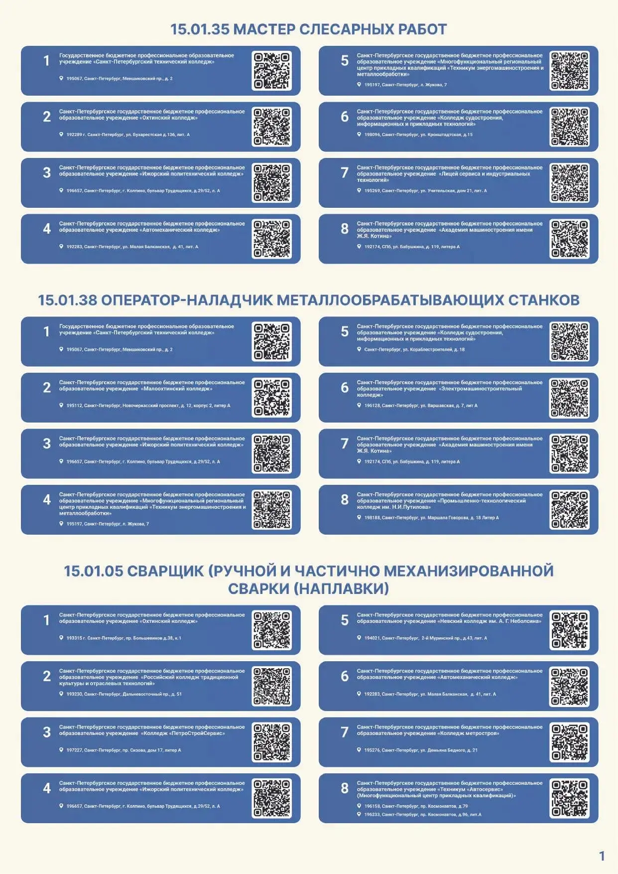 Для вашего удобства размещаем электронную версию Карты и QR-коды на страницы приемных комиссий официальных сайтов профессиональных образовательных организаций Санкт-Петербурга, участвующих в эксперименте.