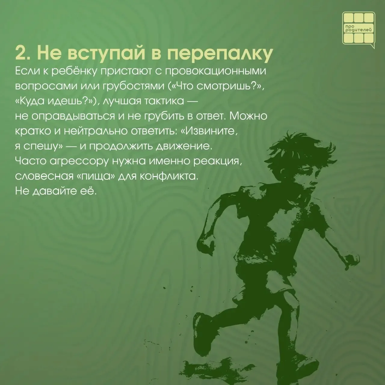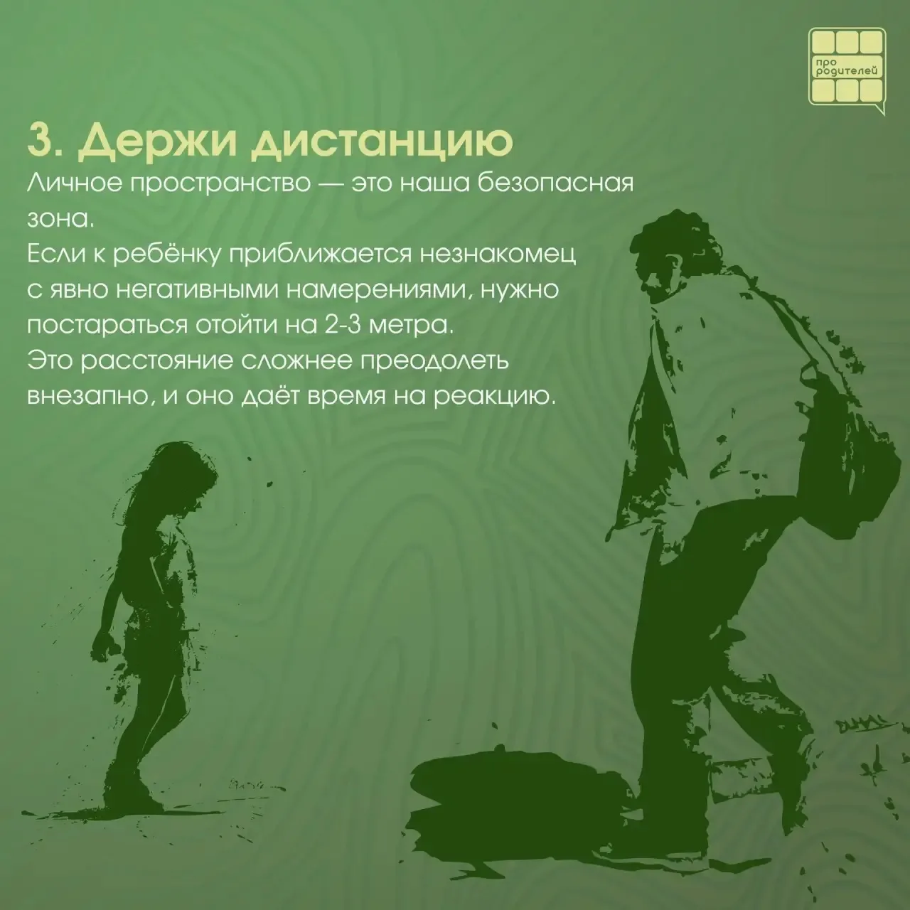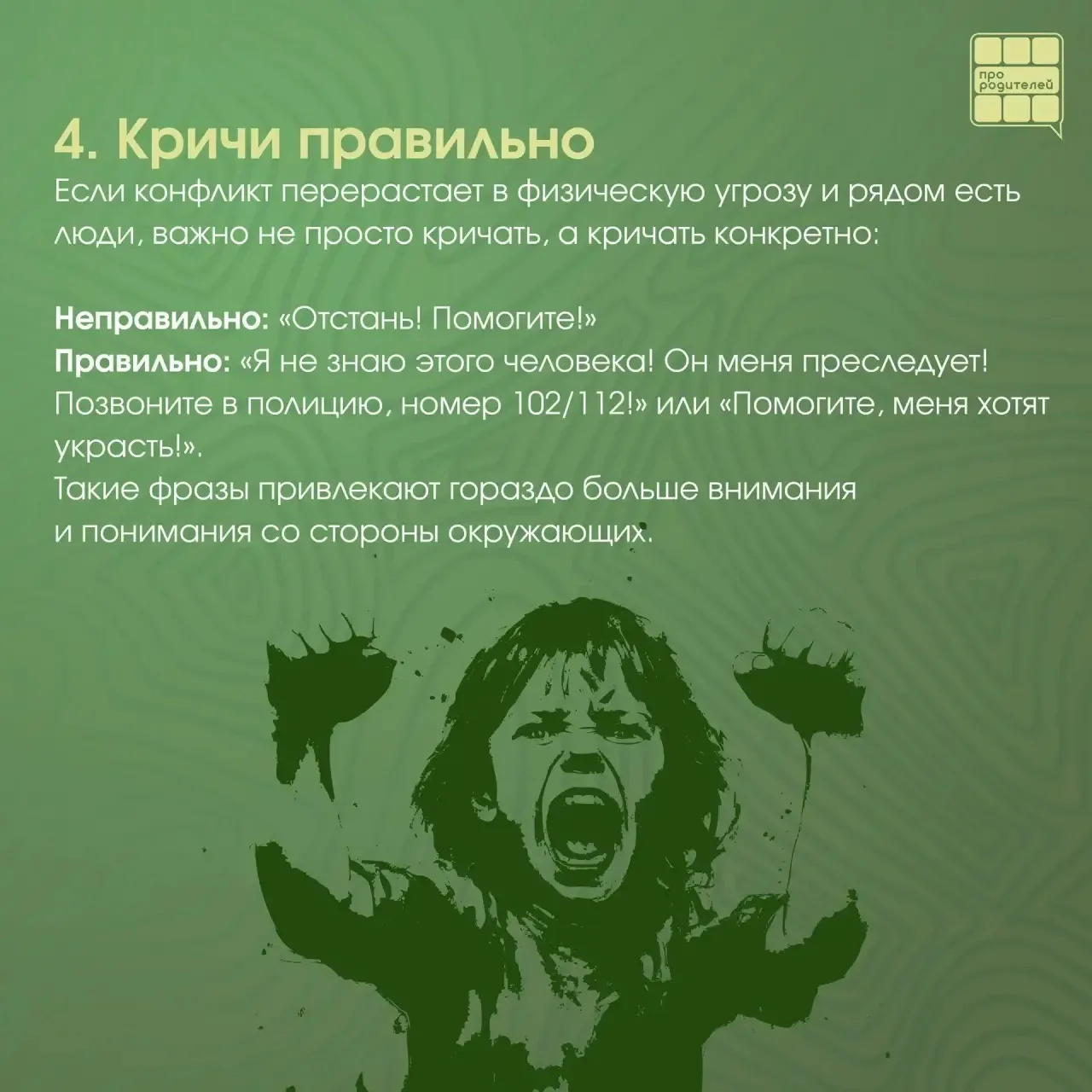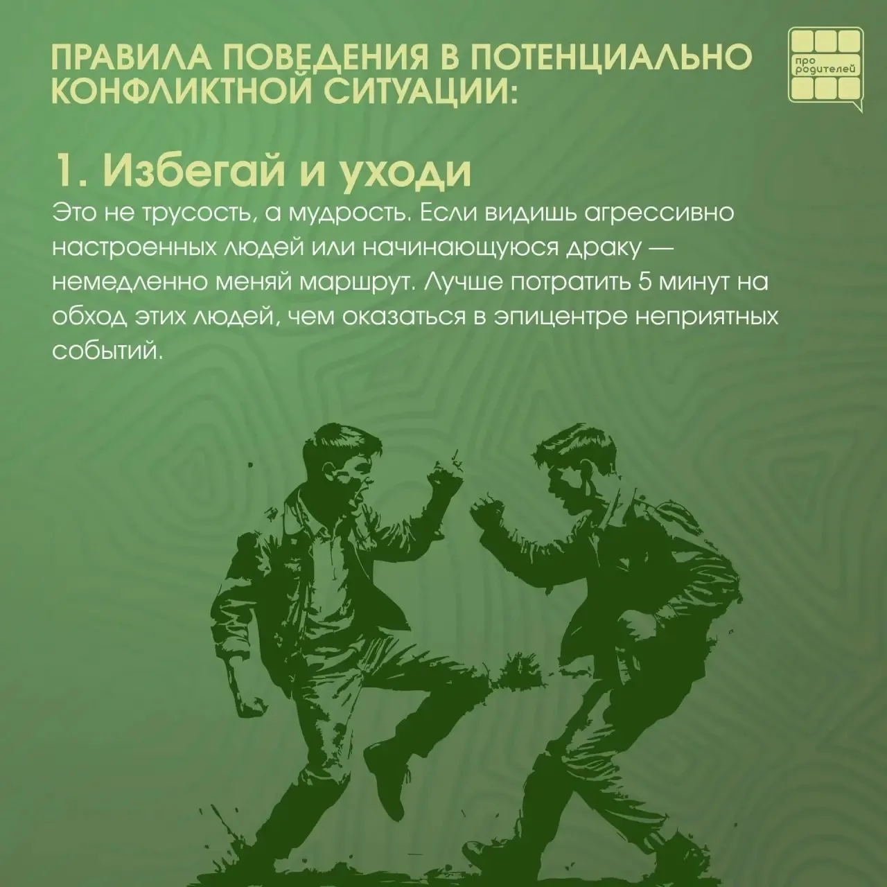 👨👩👧 Задача родителей — не запугать ребёнка, а научить его грамотно действовать, чтобы не пострадать ни физически, ни морально.